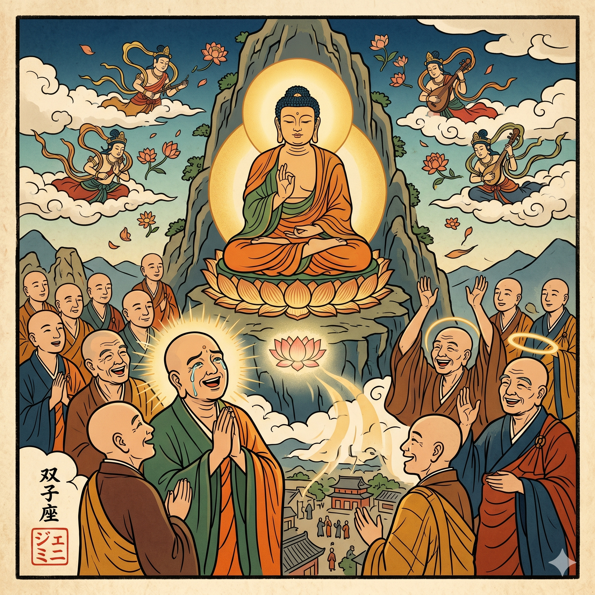 Hearing this, the king felt great joy in his heart and passed away. He was reborn in the land of Immovable Buddha to be the first disciple of this Buddha. Those of the king’s generals, soldiers, people, and clansmen who followed him in the battlefields or felt happy at seeing the king fight for the True Dharma all aspired for Buddhahood without ever falling back. When they died, they all were reborn in the land of Immovable Buddha. When Monk Virtue Consciousness died, he, too, was reborn in the land of Immovable Buddha, becoming the second disciple of this Buddha among all those who heard Him preach.