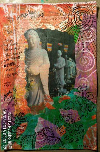 ![From Ryusho Shonin's blog post: "In both of my art pieces for [Chapter 4] I used translucent layers in a variety of ways. The idea was to show how even though our appearance or behavior at times seems to not be that of the Buddha or of the teachings of the Lotus Sutra, underneath however because of our practice we are changing. Underlying the outward appearance is the emerging manifestation of Enlightenment.](https://www.500yojanas.org/cms/wp-content/uploads/2016/06/ryusho-LS-illustration.jpg)