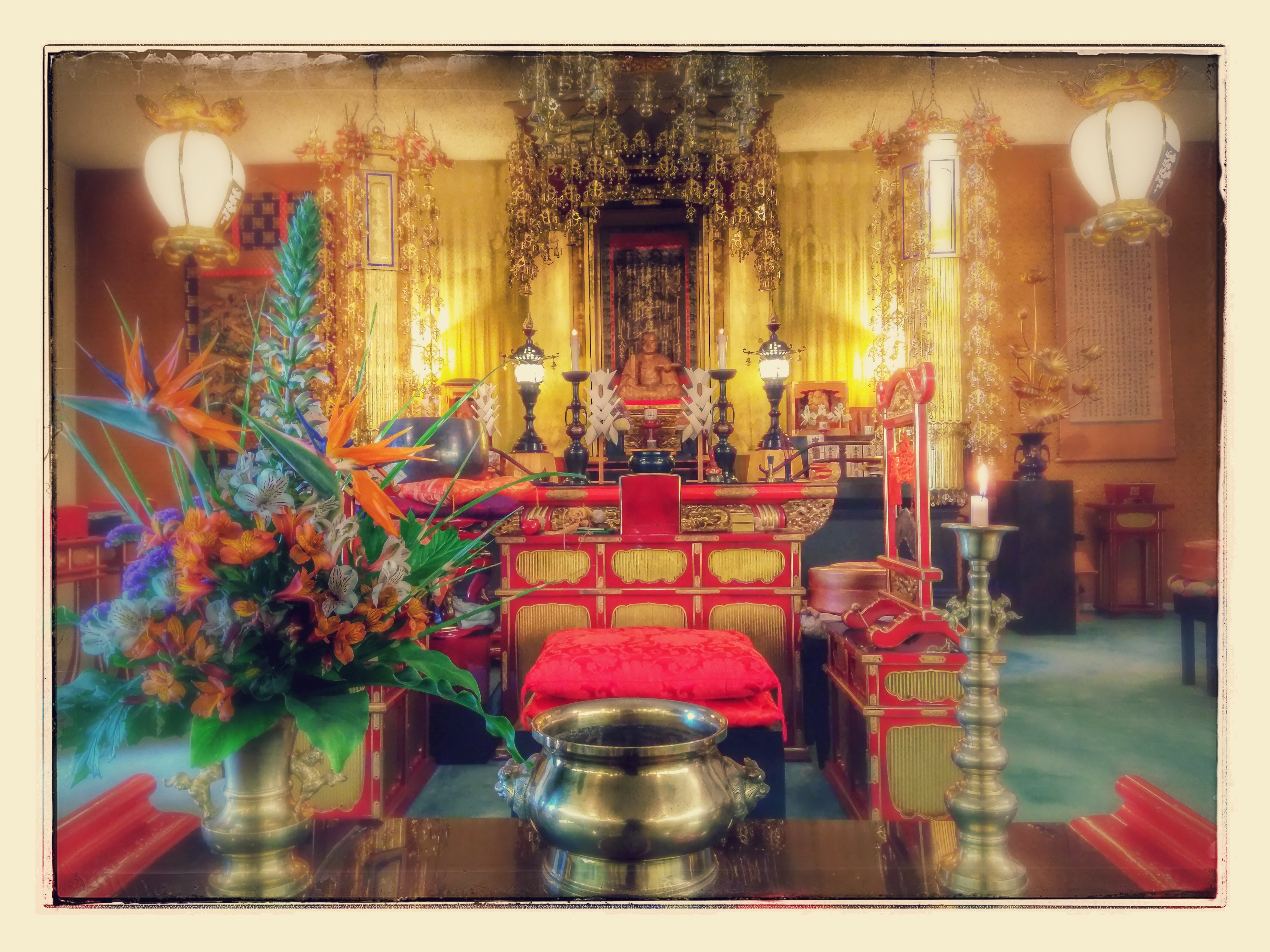 Attended services at the Sacramento Nichiren Buddhist Church Sunday. After each service I take a photo of the flowers arranged by Rev. Kenjo Igarashi‘s wife, Nihoko. Periodically, Google likes to volunteer an enhanced version of the photo and that’s what I’ve got here. (Here’s the original.)