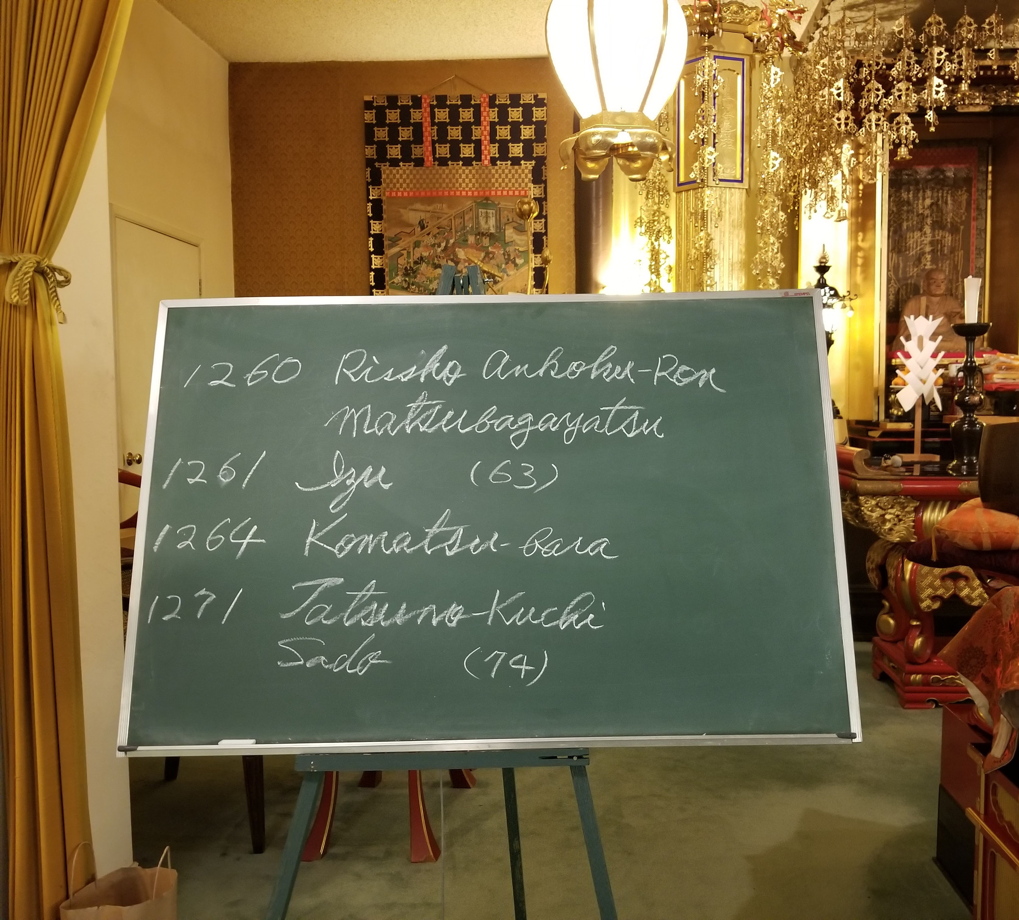 “Furthermore, Ajita! Anyone who goes to a monastery in order to hear this sūtra and hears it even for a moment while he is sitting or standing, in his next life will be able to go up to the palace of heaven, riding in a beautiful and wonderful elephant-cart or horse-cart or in a palanquin of wonderful treasure by his merits. Anyone who, while sitting in the place of the expounding of the Dharma, persuades another per on to it down or shares his seat with him to hear [the Dharma] when he sees him coming to the place, in his next life by his merits, will be able to obtain the seal of King Sakra, of the Brahman Heavenly-King or of a wheel-turning-holy-king.