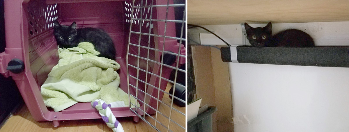 So I continue the quest to tame my foster kittens. It took me several tries today to find their hiding places. The carrier was easy enough, but the wire raceway under my desk was a stroke of genius – a black kitten hidden in the darkest corner under the desk.