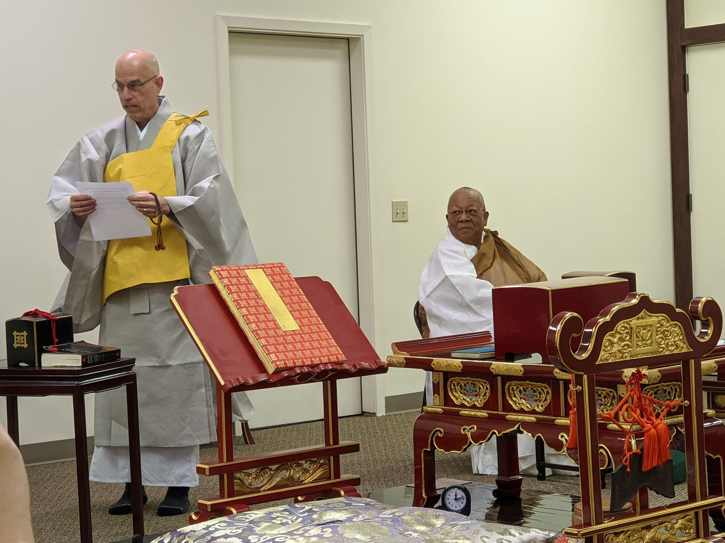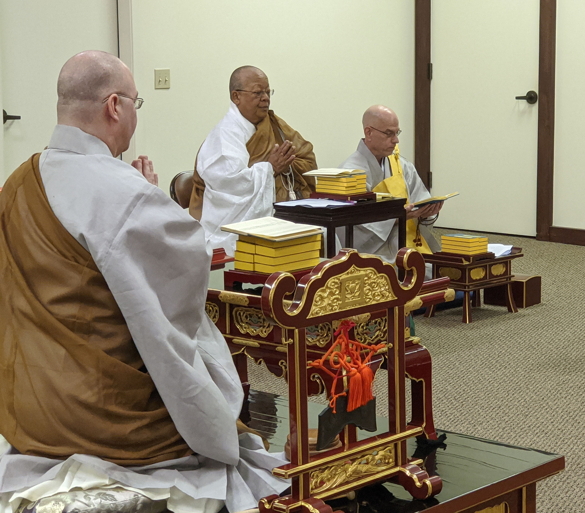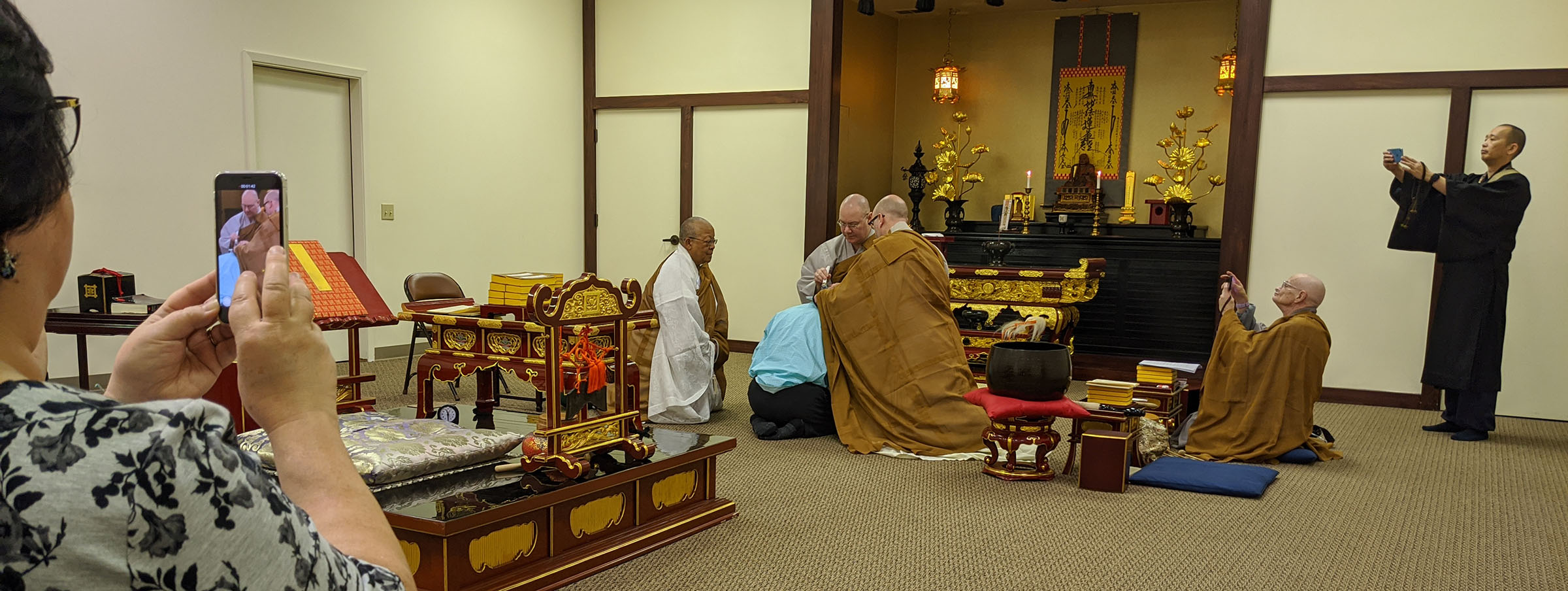 Mark Herrick bowing as Rev. Ryuei reads his “Respectful Address.” Nichiren Order of North America Bishop Myokei Caine-Barrett is at left. At right, Kanjin Cederman Shonin Head Priest Seattle Choeizan Enkyoji Nichiren Buddhist Temple. Far right is Ryusho Jeffus of Syracuse, New York.
