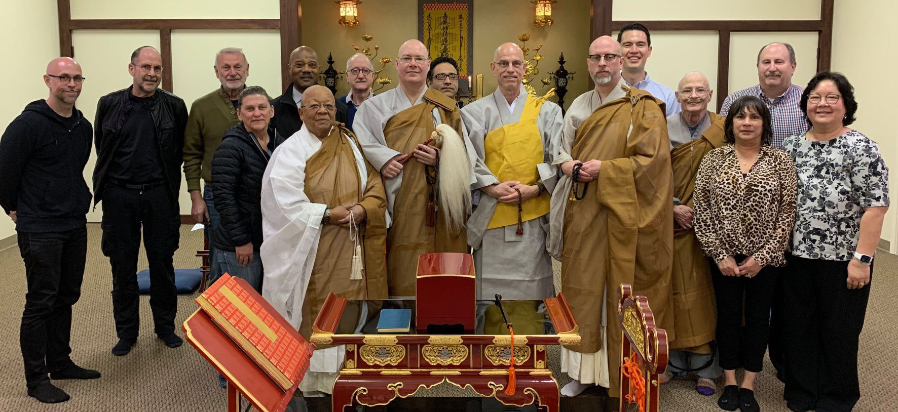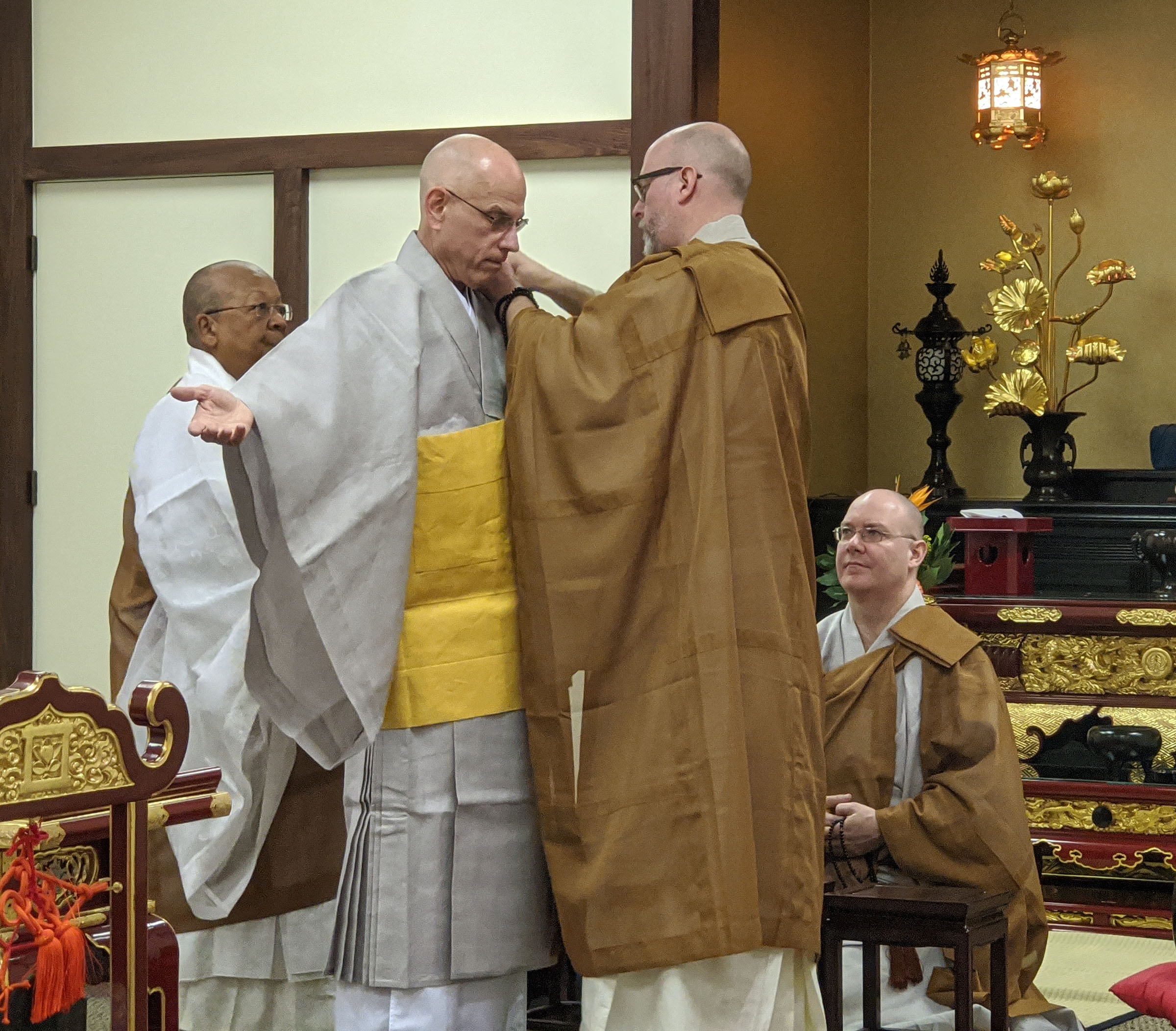 Here is a good man, who is undertaking the ceremony of crossing over and receiving the precepts before the Buddha, the founder, and the Three Treasures. His name is Mark Herrick. Since he was born in this world, spring and fall have passed 63 times. His previous good roots have now met with opportune conditions so that he has finally made the determination to leave home and accept the precept of the Lotus Sutra and wear the black-dyed robe.