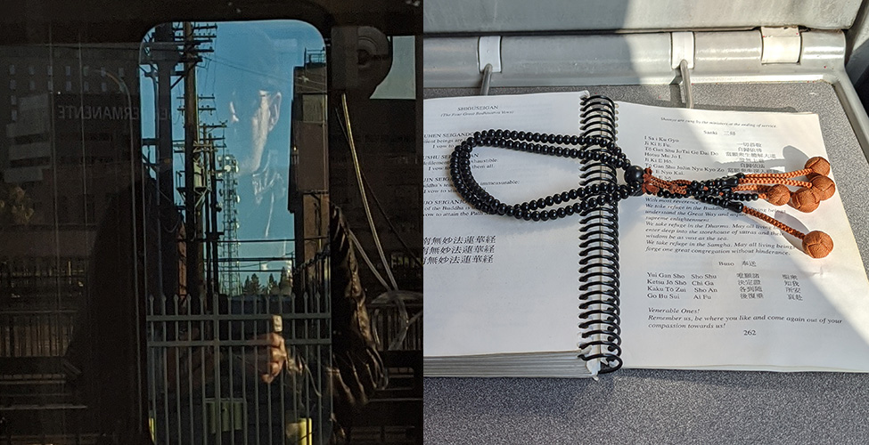 My reflection in the train door while waiting to board in Sacramento and my beads and sutra book after completing gonyo on the way to Hayward.