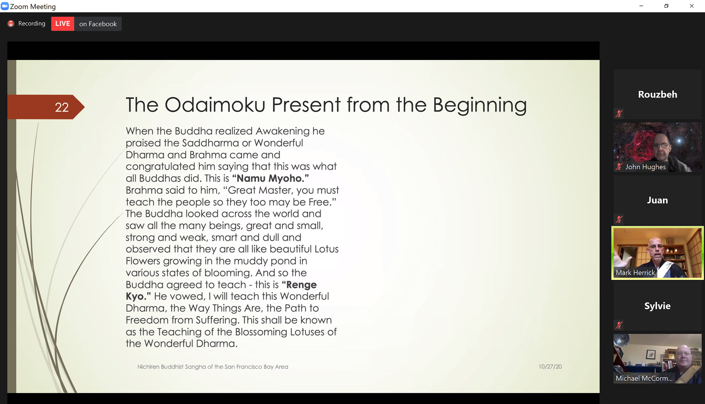 After another tea break and an online game of Go (I won), I joined Rev. Ryuei McCormick and Shami Ryugan Herrick and the Nichiren Shu Buddhist Sangha of the San Francisco Bay Area. More than 20 people from around the world were on the call.