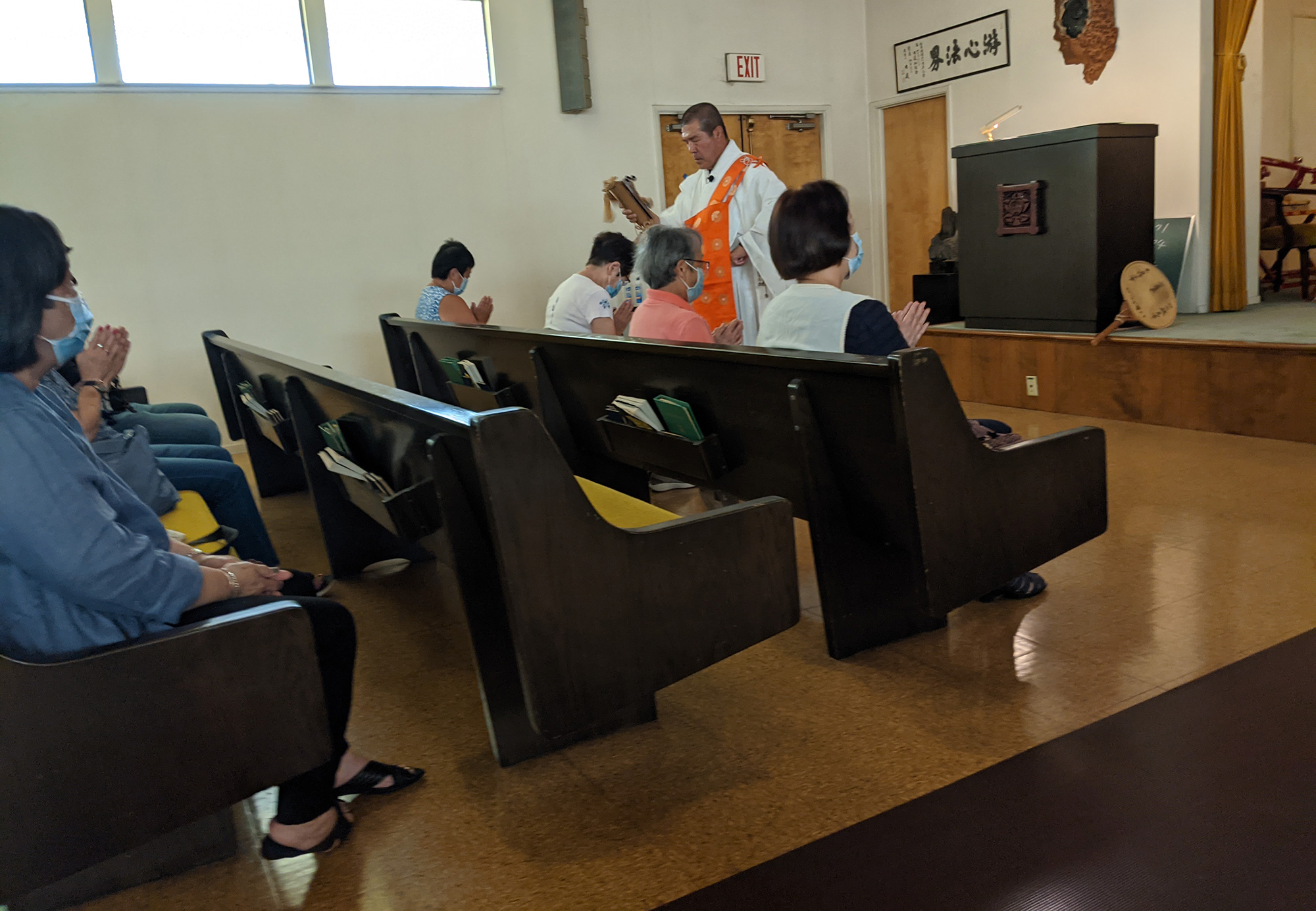 Finally, after more than a year, Rev. Kenjo Igarashi ventured into the congregation of the Sacramento Nichiren Buddhist Church to give his monthly Kito Blessing. During the pandemic Rev. Igarashi had to provide the purification blessing remotely from the altar stage without moving about the congregation.