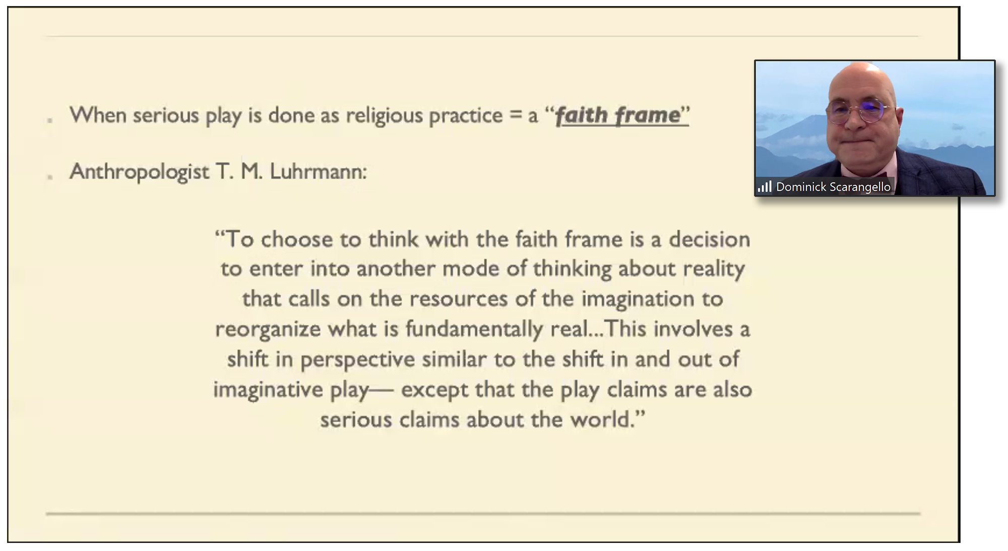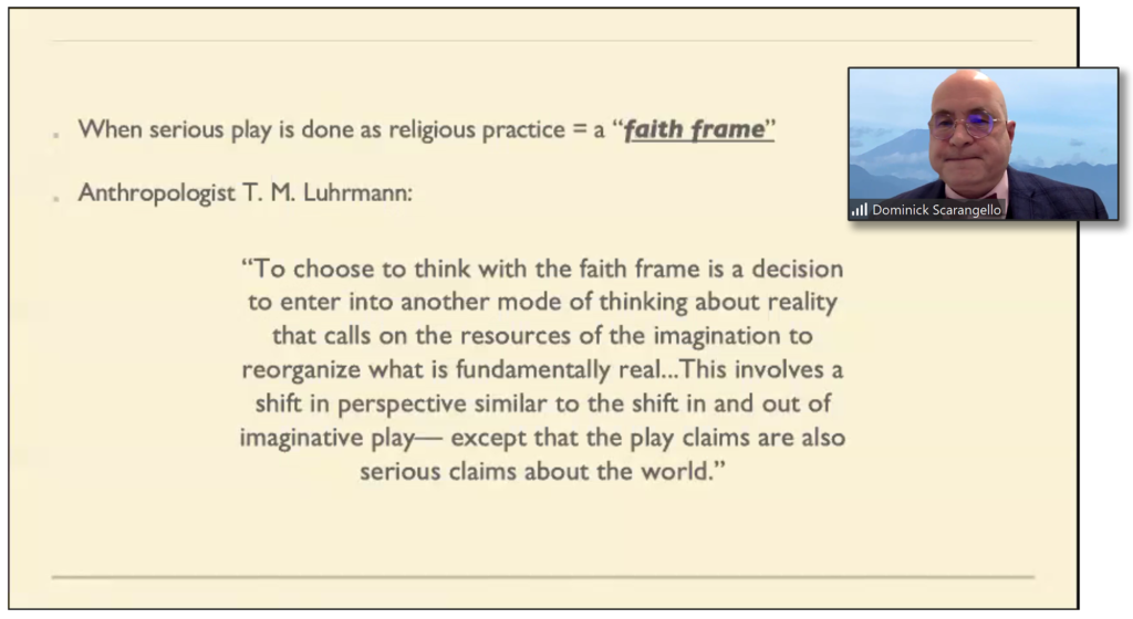 When done as religious practice, Dr. Scarangello said, such serious play is accomplished within the “faith frame.” Quoting from Stanford University anthropologist T.M. Luhrmann: