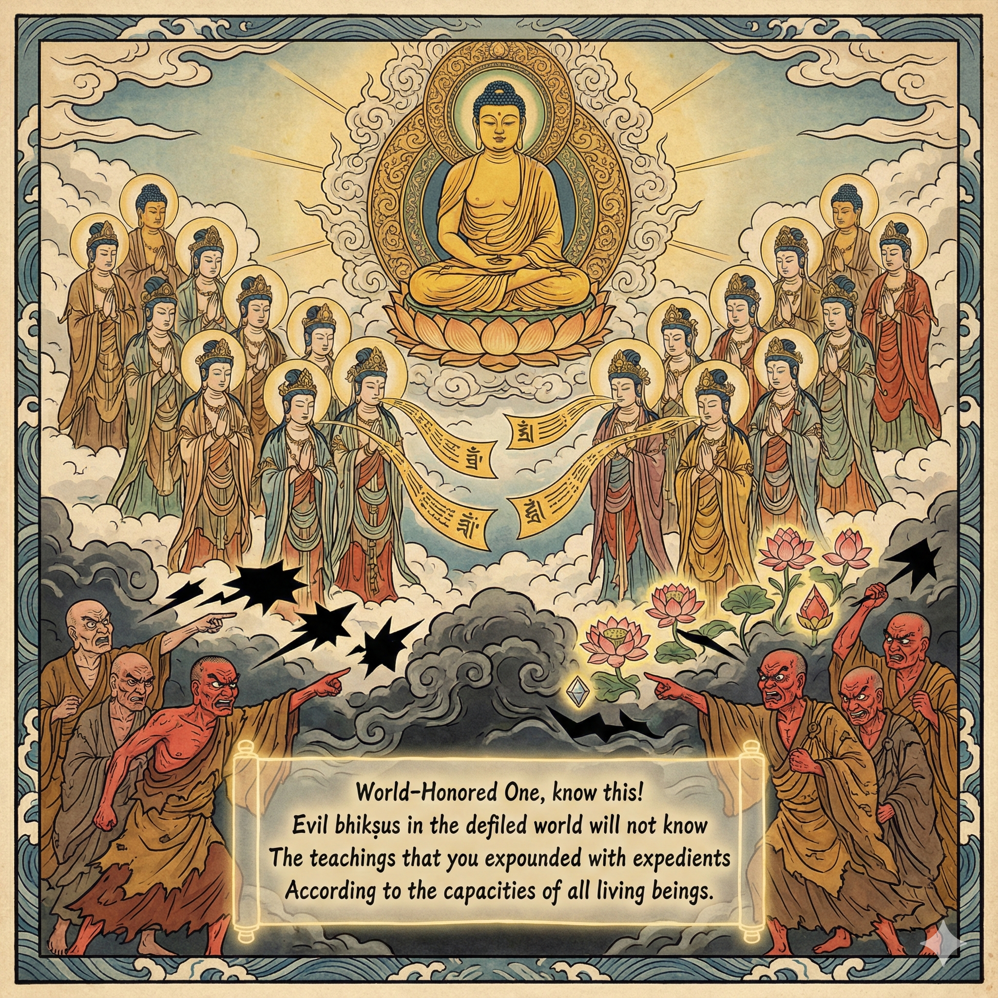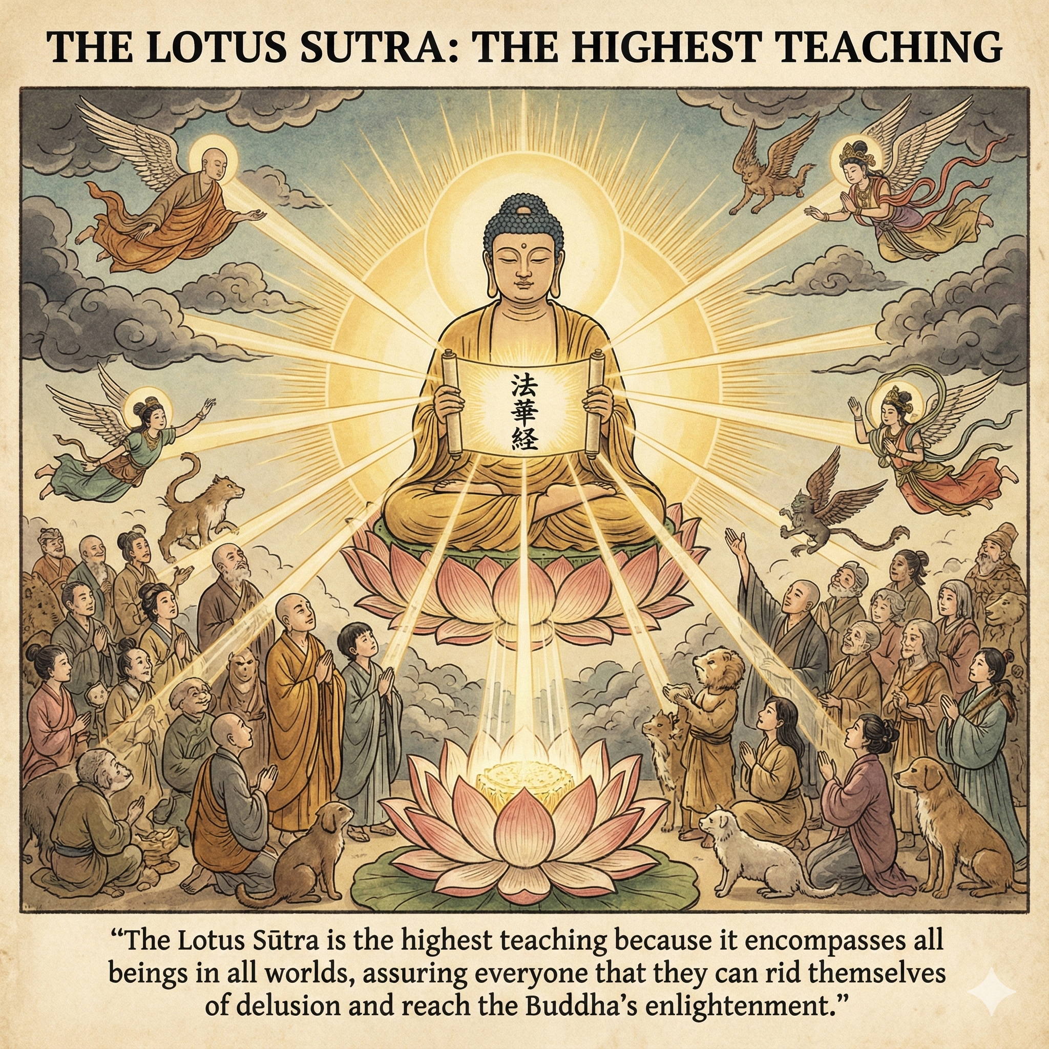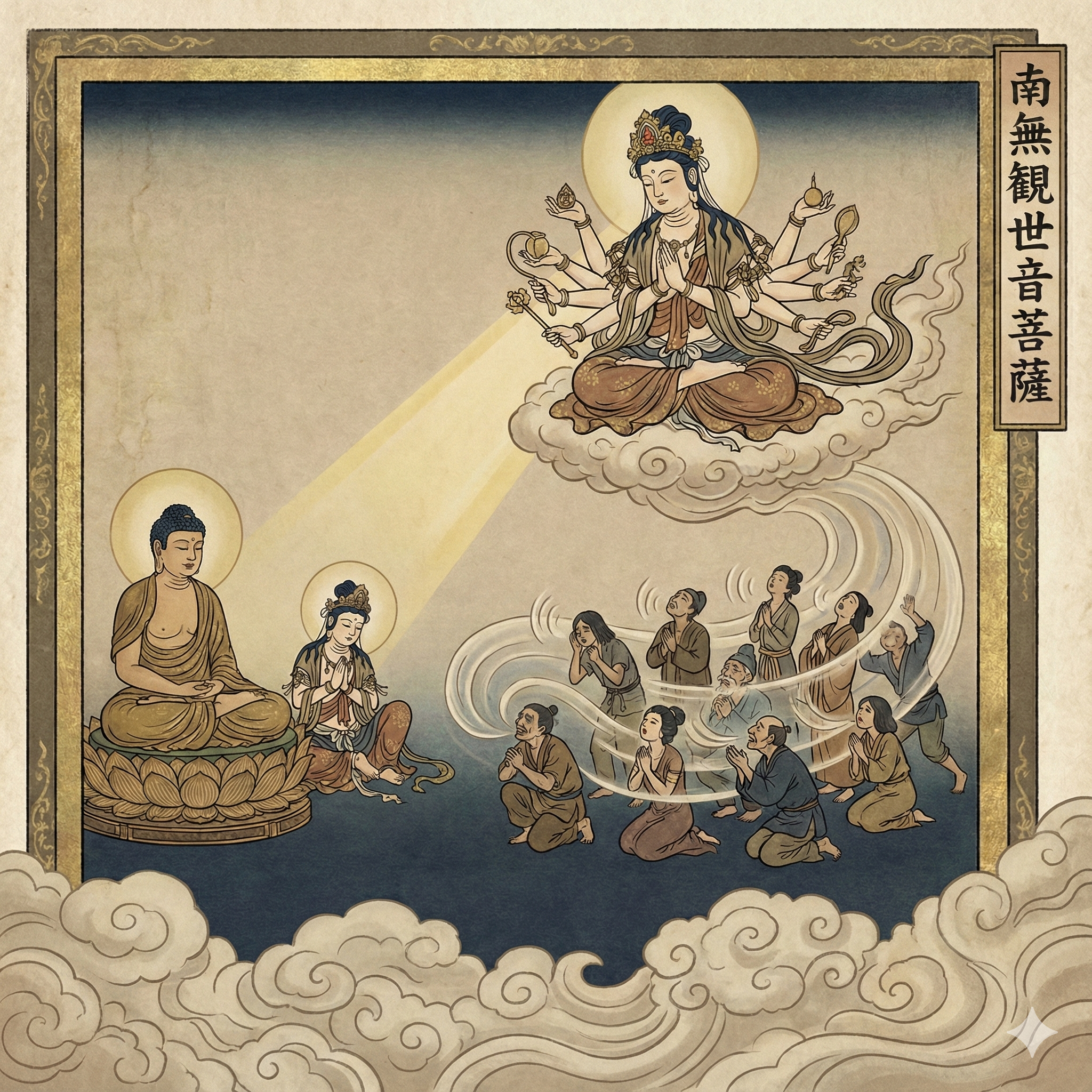 This central Bodhisattva acts as the visual anchor for the text excerpt from the Lotus Sūtra.