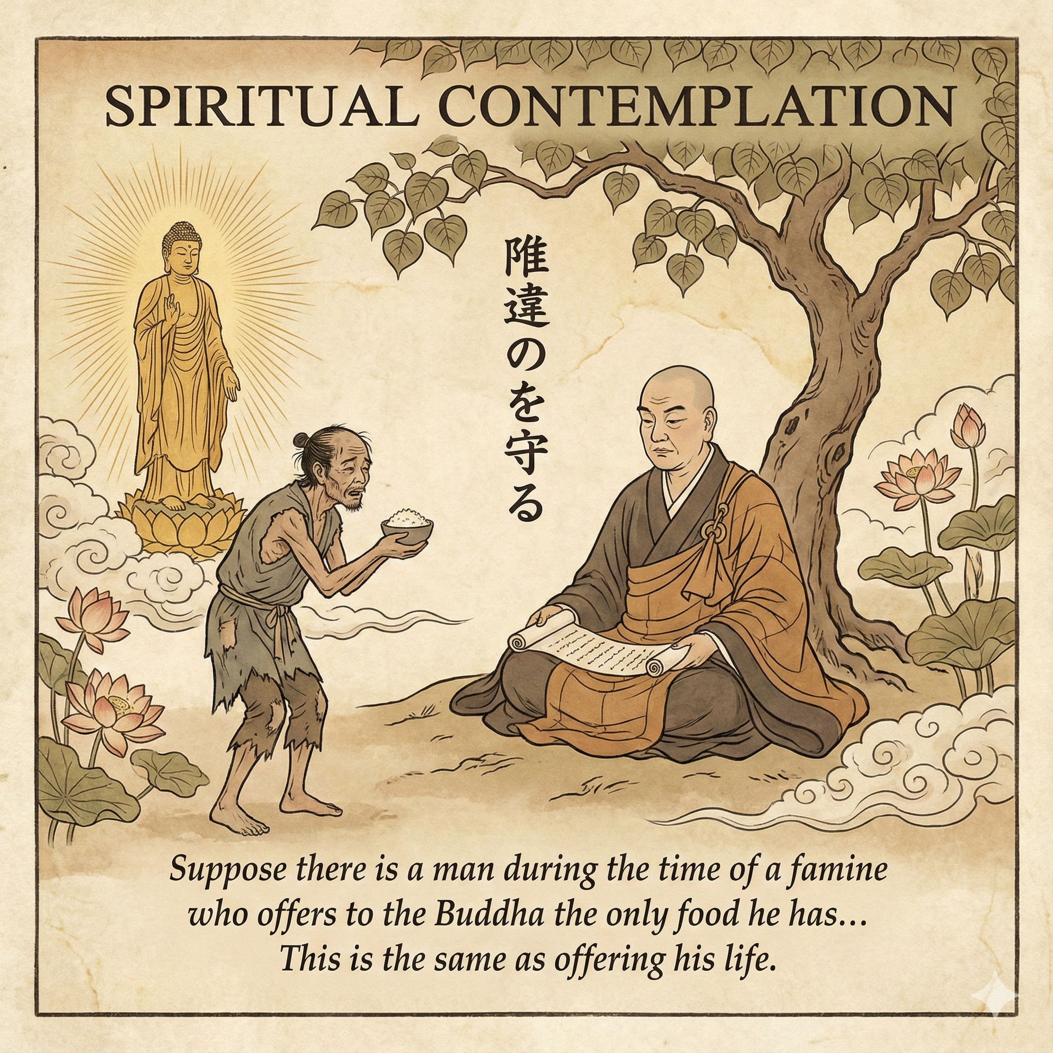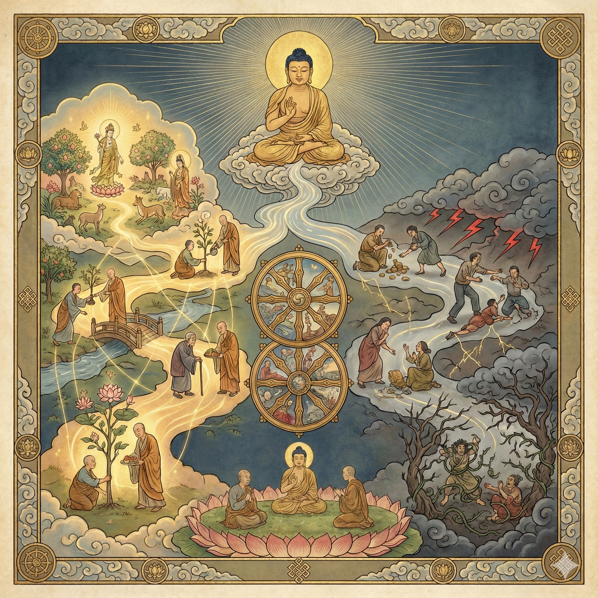 The Halo and Position: The golden halo and their elevated position above the globe establish them as an enlightened archetype. They are the ideal model of compassion that the text encourages us to emulate.