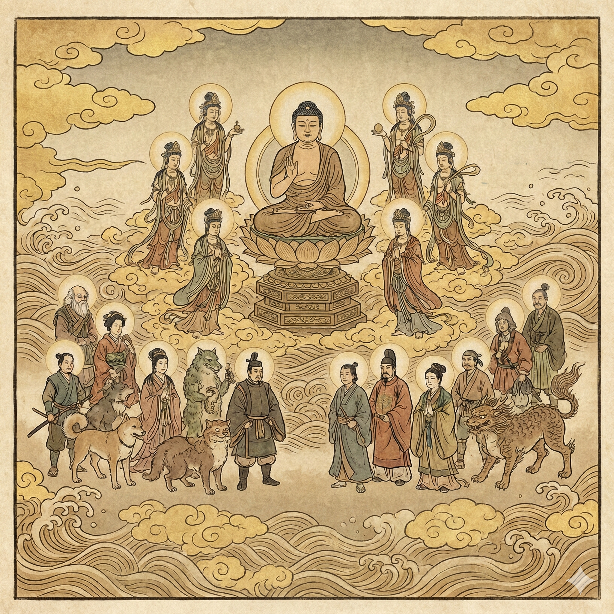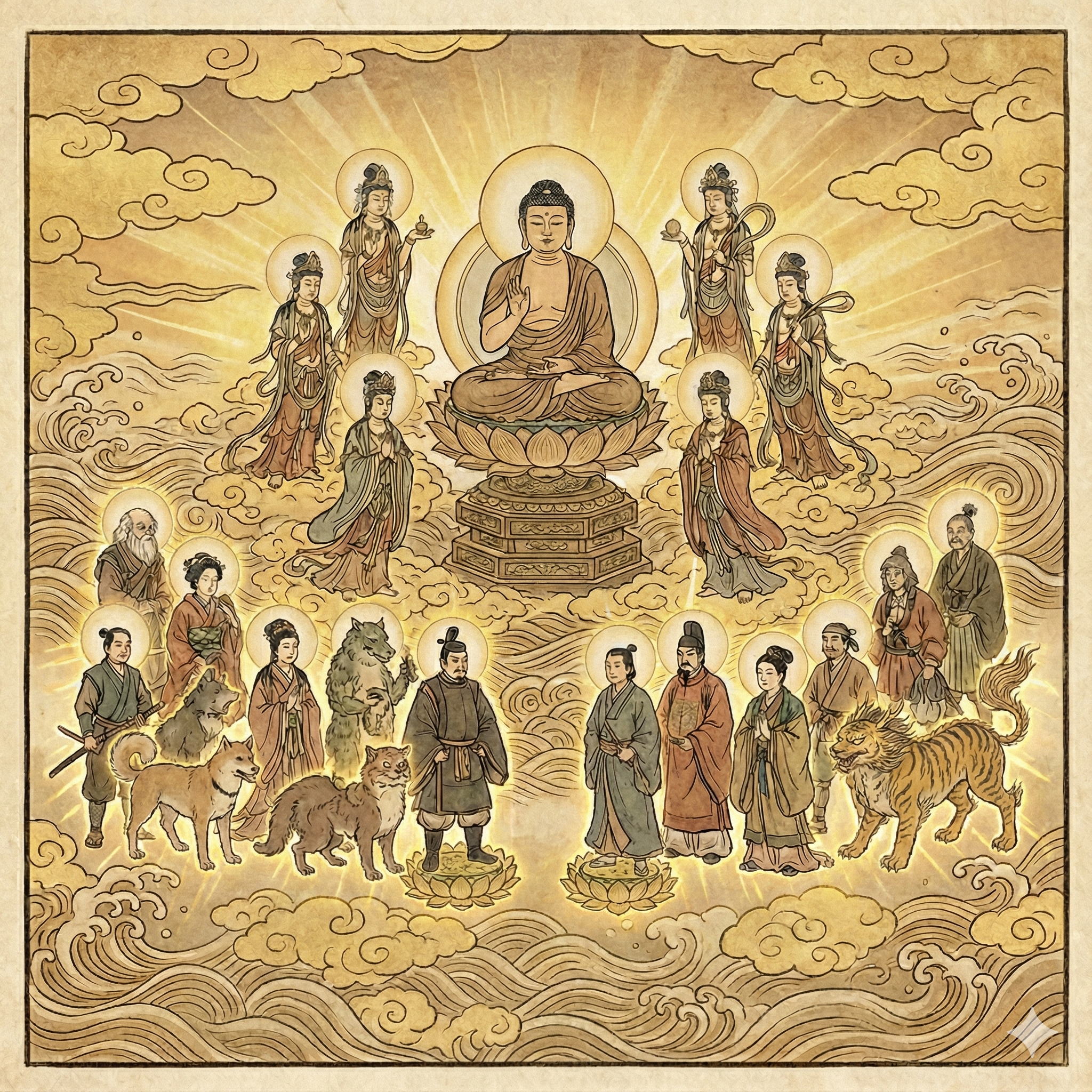 I’m now focusing on transforming the human figures at the ground level into Bodhisattvas. They will wear robes, crowns, and have halos, floating on lotus clouds. Animals will also receive glowing symbols. The goal is to enhance the overall golden light and divine energy to emphasize the transformation, while keeping the Ukiyo-e style and aged paper texture.