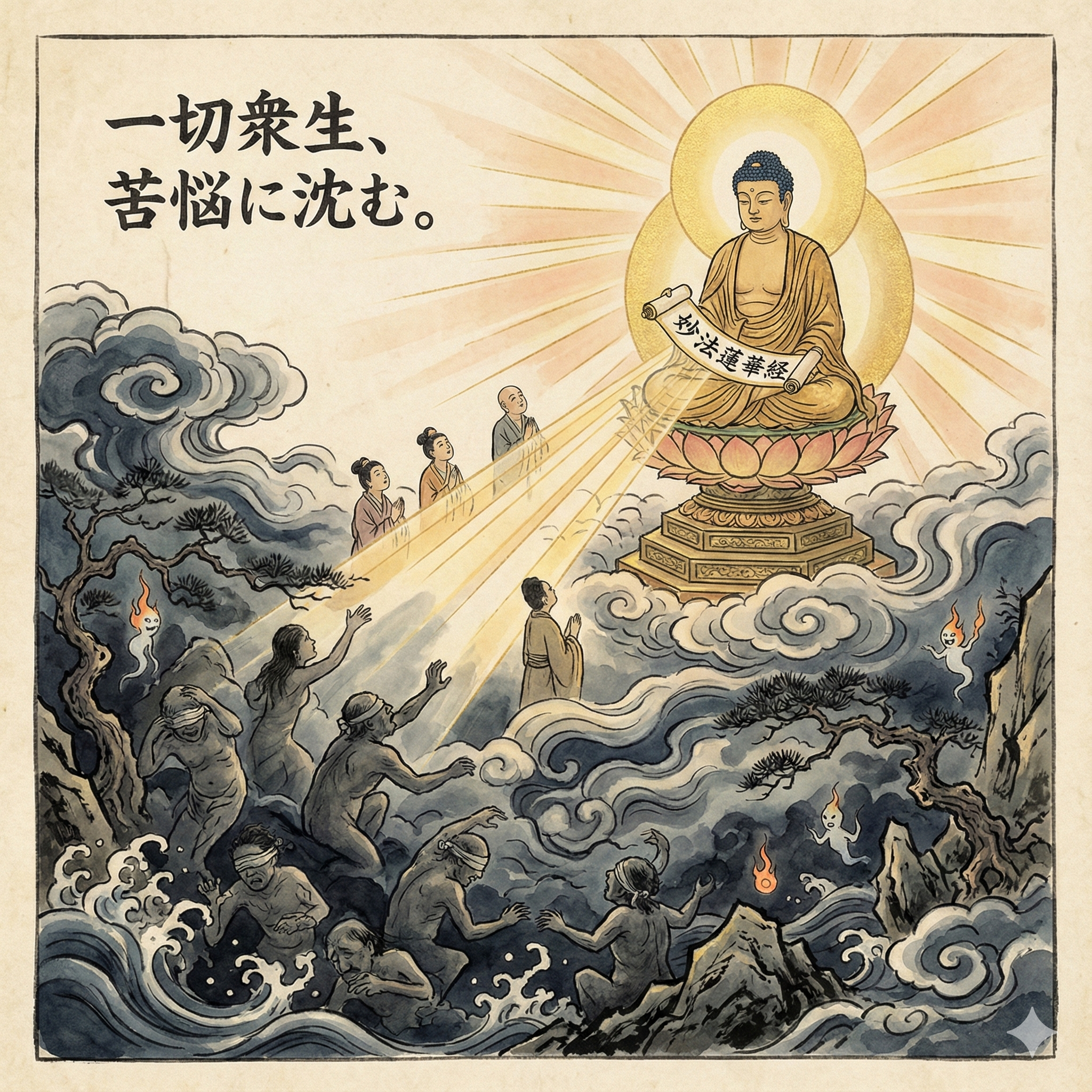 I'm now zeroing in on the Buddhist aspects requested. I've broken down the central quote from the Lotus Sūtra and am evaluating the key elements that need to be visually present to convey the core meaning. Next, I need to come up with ideas to communicate the themes effectively. The next iteration will refine these concepts into something more concrete.