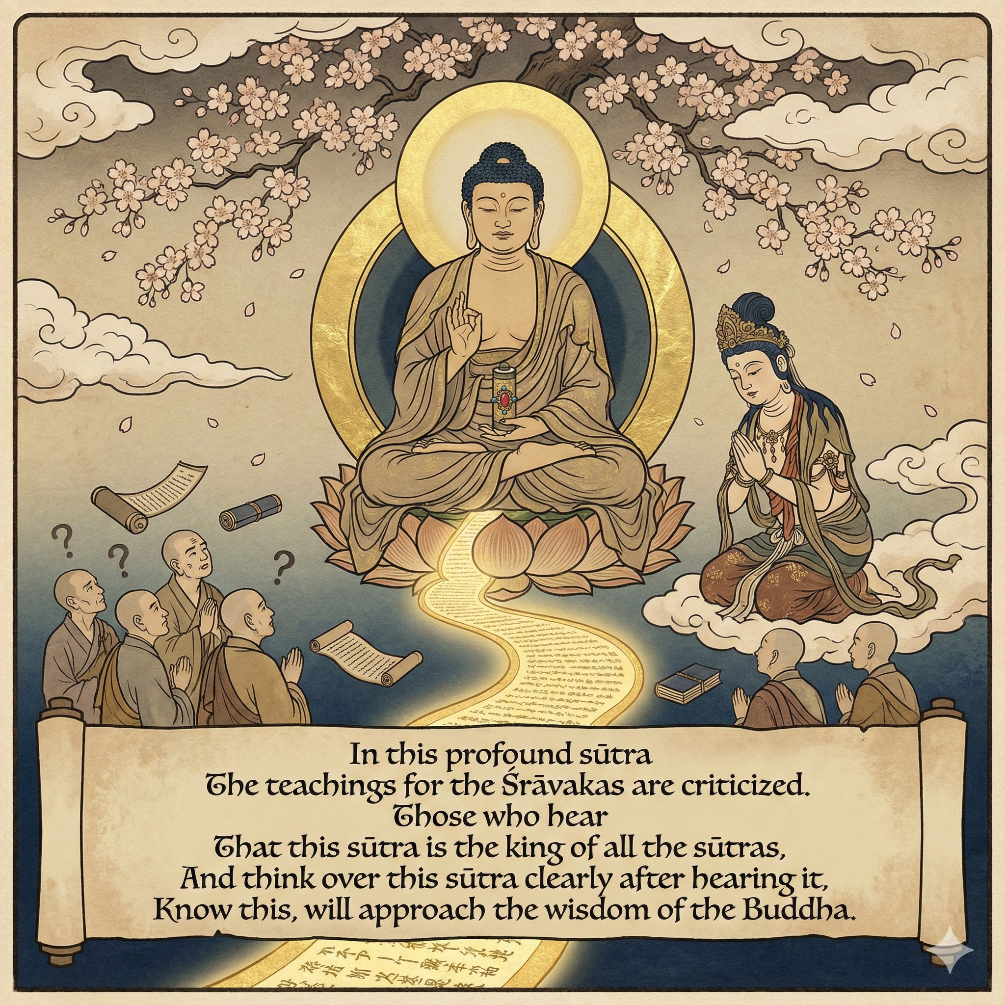 The Buddha sings these verses to Medicine-King Bodhisattva in Chapter Ten of the Lotus Sūtra. He has already declared that the sūtra he is teaching is the closest to his own wisdom, that it is different from anything he has taught before, and that it is the teaching for Bodhisattvas. The expedient teachings he gave to Śrāvakas before this sūtra were limited because they did not show the way to enlightenment for all beings. As we keep this sūtra in our minds, and learn to recognize it in our daily lives, we not only approach our own enlightenment, we lead all beings to enjoy the Buddha’s wisdom.