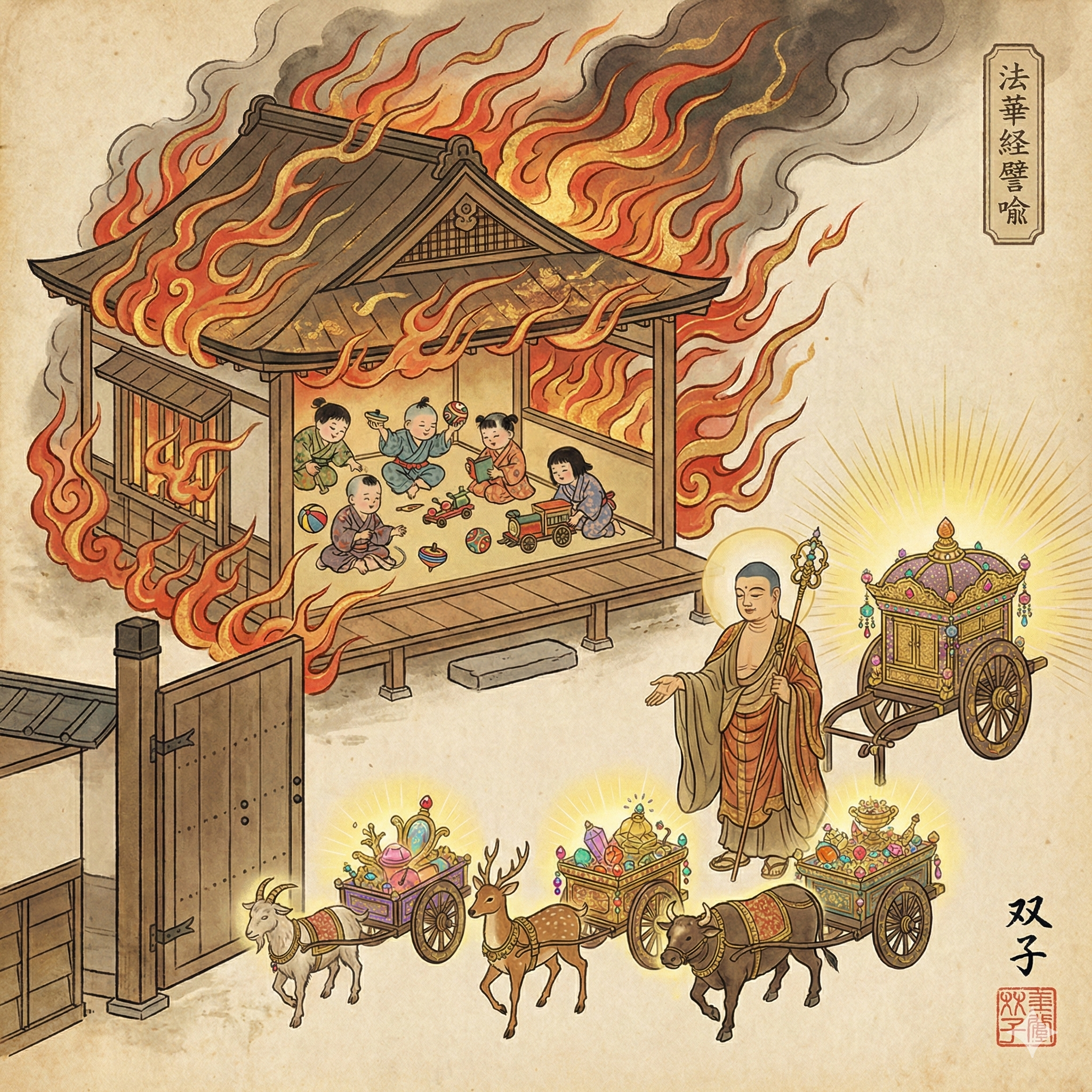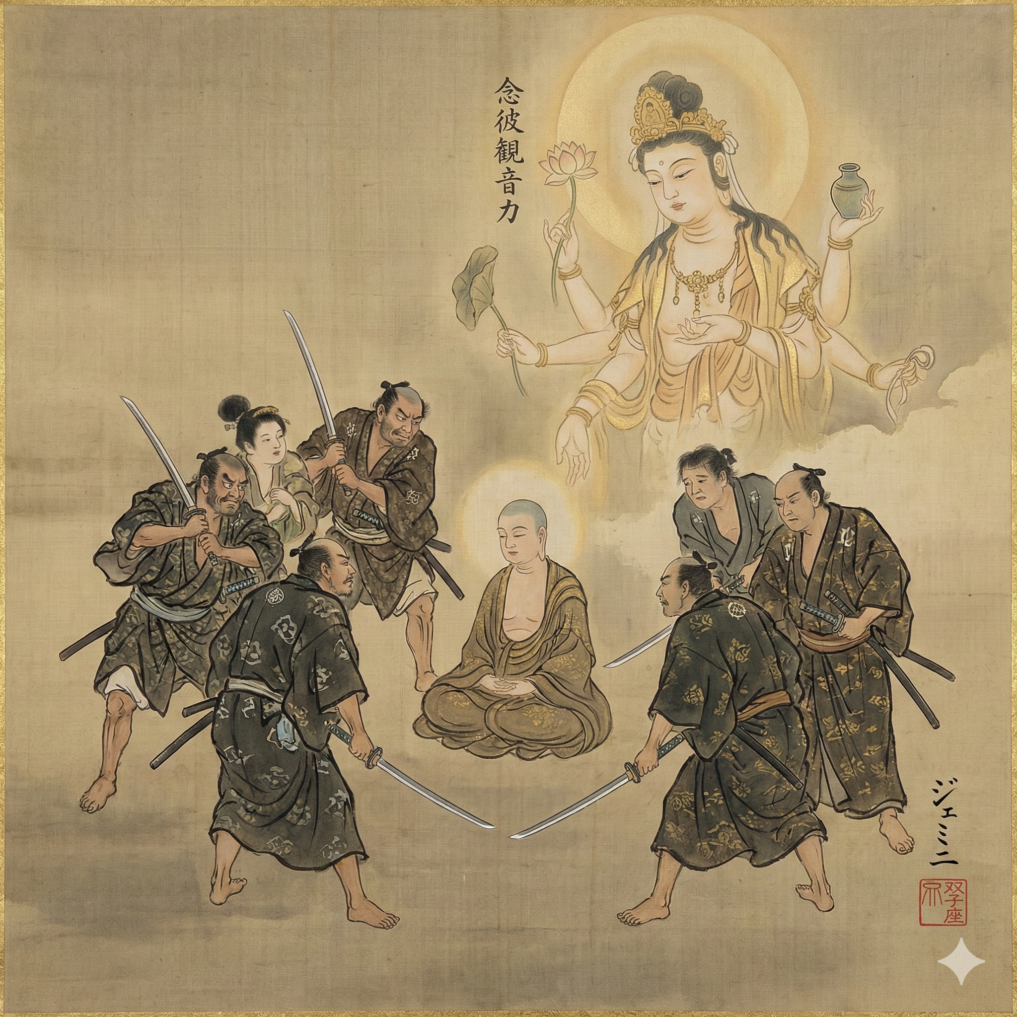 This text is a Buddhist verse, likely from a sutra like the Lotus Sutra, which the painting depicts.