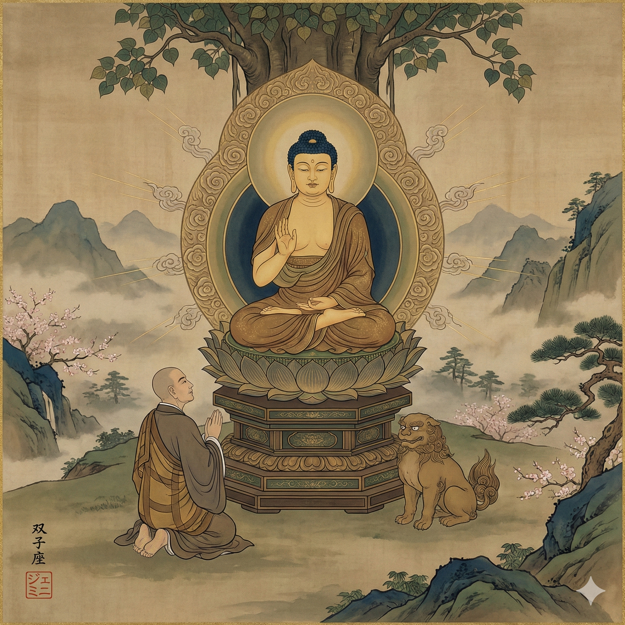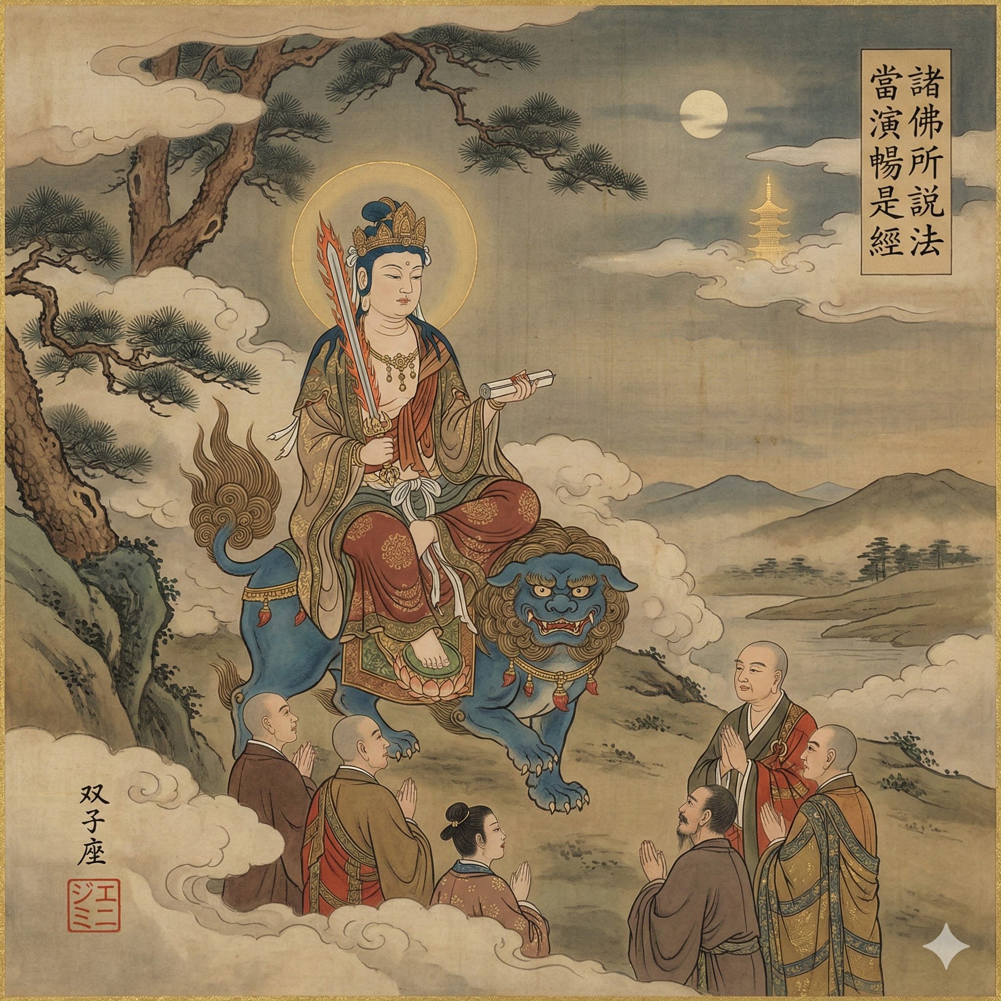 I am now focusing on the visual composition, deciding the elements. I've chosen Monju Bosatsu, seated on a lion and holding a sword and sutra scroll. I'll add two attendants and stylized pine trees. I'll place the figures on a cloud-shrouded mountain peak, with a golden halo and moonlit sky. I plan to incorporate a Dharma text in classical Kanji: 「諸佛所說法 / 當演暢是經」.