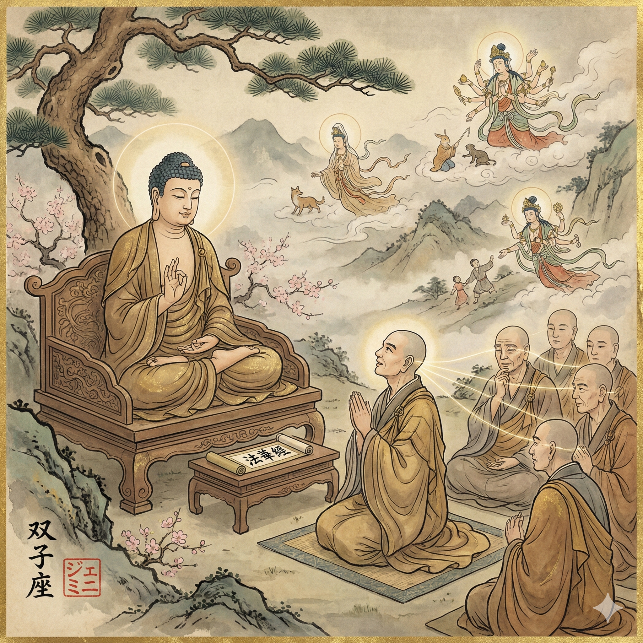 On the night of the fifteenth of the seventh month when the Buddha was about to enter the temple, Indra and the King of the Brahma Heaven built three bridges made of gold, silver, and crystal from the Trāyastriṃsá Heaven. The Buddha entered by the middle bridge, while Indra on his left and the King of the Brahma Heaven on his right held a canopy over the Buddha. Behind the Buddha came the four categories of Buddhists (monks, nuns, laymen, and laywomen); the eight kinds of supernatural beings (gods, asura, dragons, gandharva, kiṃnara, garuda, mahoraga, and yakṣa); twelve hundred arhats led by Kāśyapa, Kātyāyana, Maudgalyāyana, and Subhūti; twelve thousand hearers; and eighty thousand bodhisattvas.