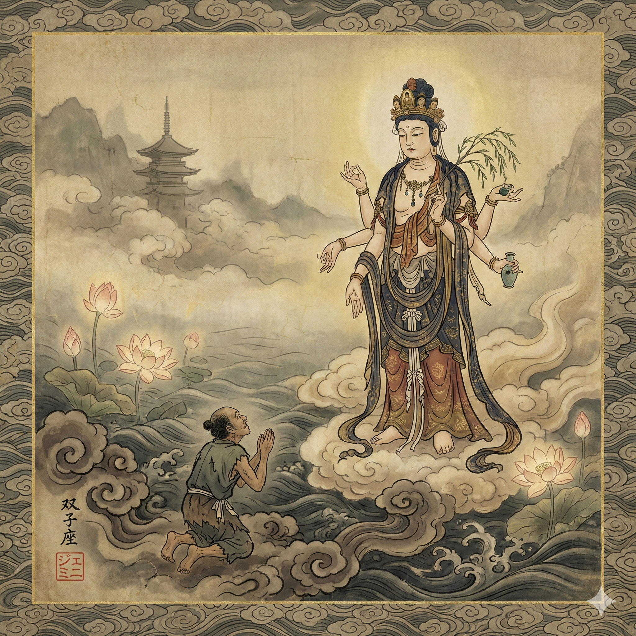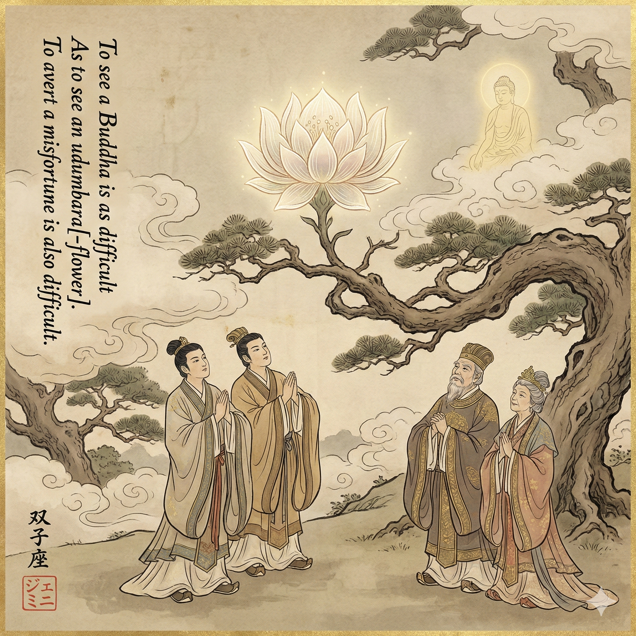 After much thought, she cut off her own hair, and braided it into a wig that she sold to buy oil for a single lamp. Perhaps because her devotion was accepted by the Buddha and gods, the three treasures, the heavenly deities, and the terrestrial deities, her lamp alone was not extinguished by the fierce winds that blow at the destruction of the world and the beginning of a new world cycle, and it lit the way as the Buddha entered the Jeta Grove Monastery.