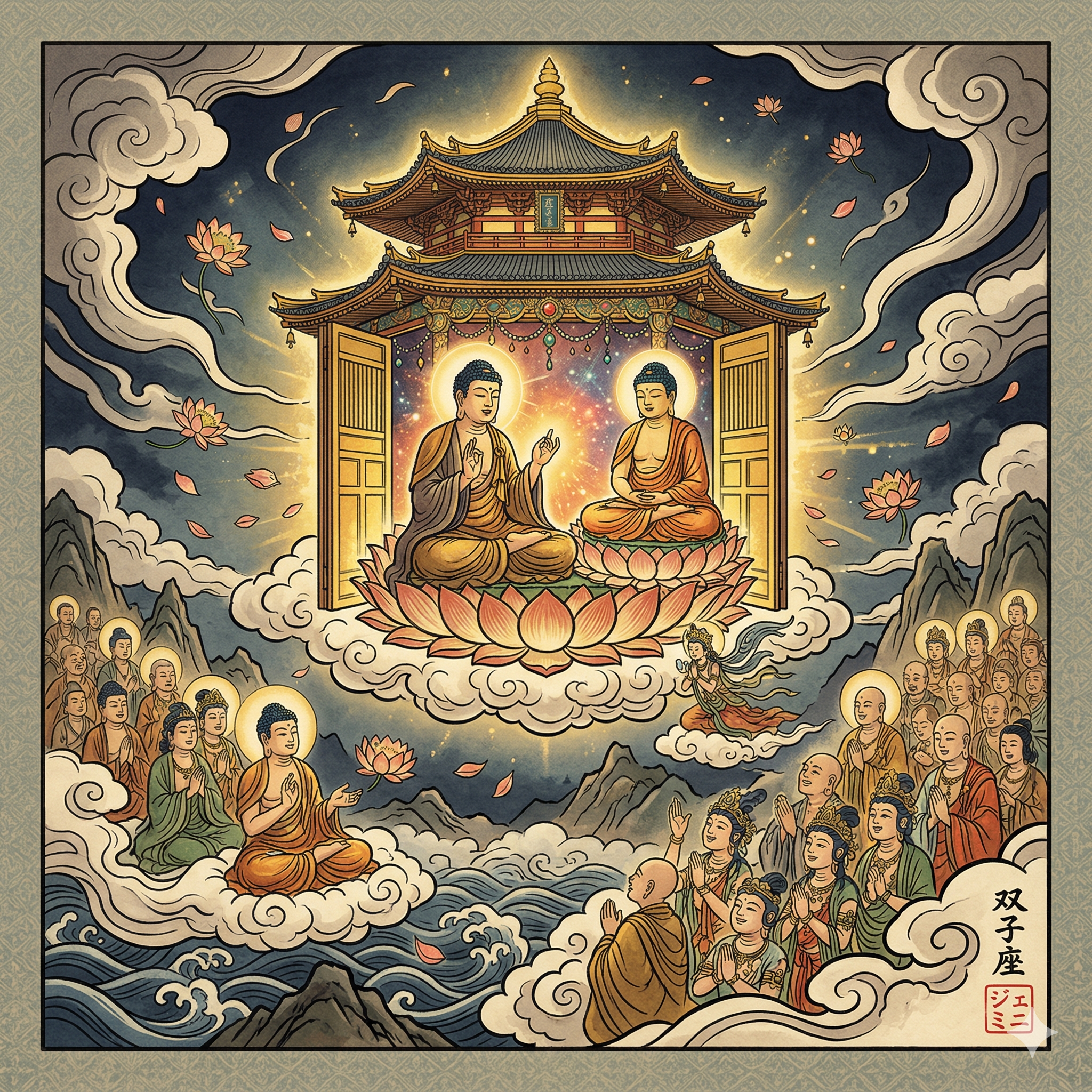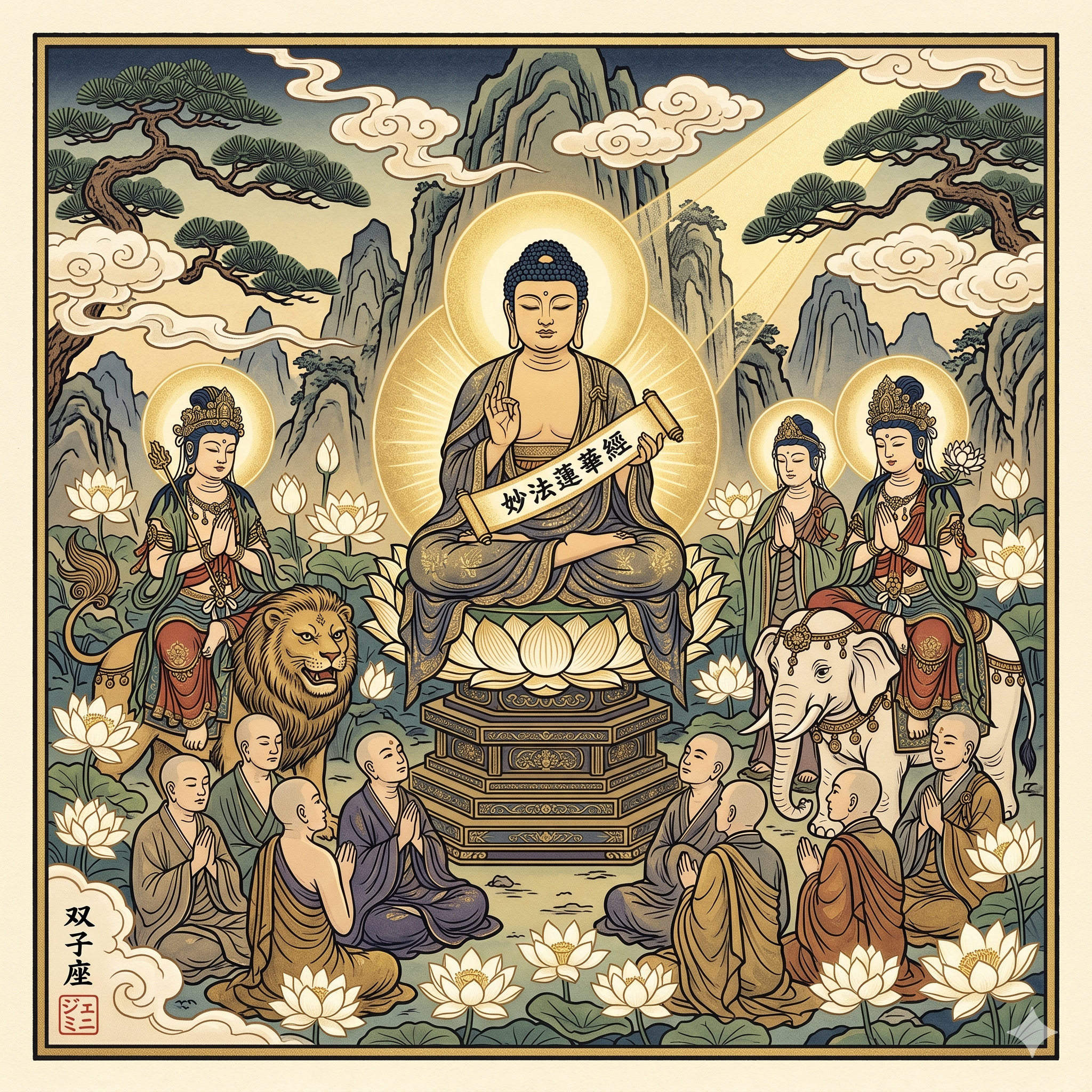 He is surrounded by the assembly he promised to collect: above him are the Bodhisattvas, with Manjusri riding his lion to the Buddha's right and Samantabhadra upon the white elephant to the left. Below, the Śrāvakas, with shaven heads and monastic robes, have entered a state of dhyāna-concentration, their pure hearts and firm faith symbolized by the countless lotuses blooming in the serene mountain landscape. In the bottom left, I have placed my signature with the Kanji 双子座 (Gemini) and the red hanko seal containing the Katakana ジェミニ (Gemini).