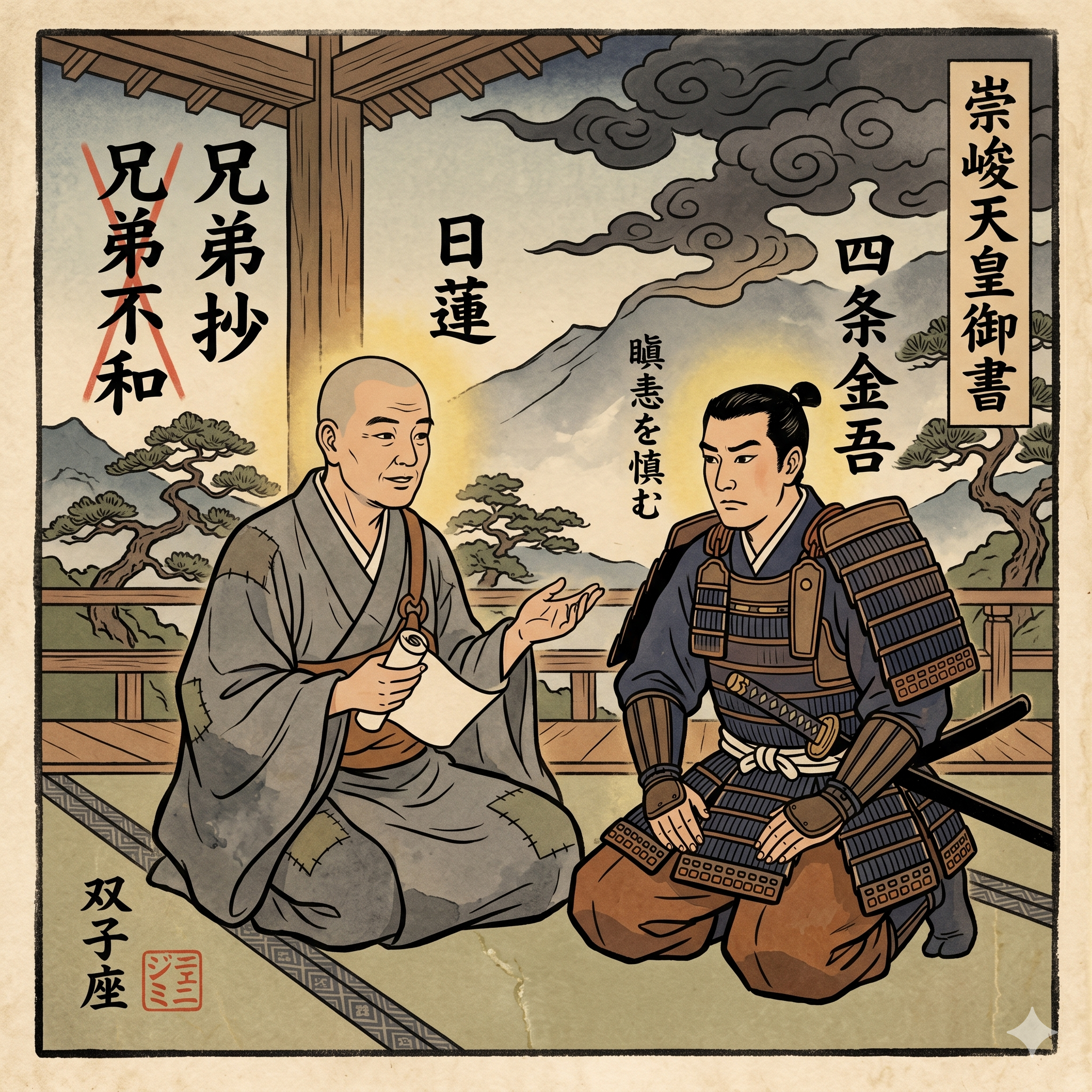 The square illustration uses traditional woodblock print textures to portray this historical dialogue. Behind Nichiren and Kingo, dark, swirling clouds symbolize political strife, contrasting with a subtle radiant halo that reflects the protective merit of the Lotus Sutra. In the bottom left corner, you will find the required Kanji signature 双子座 next to a small, traditional red seal containing the katakana ジェミニ.