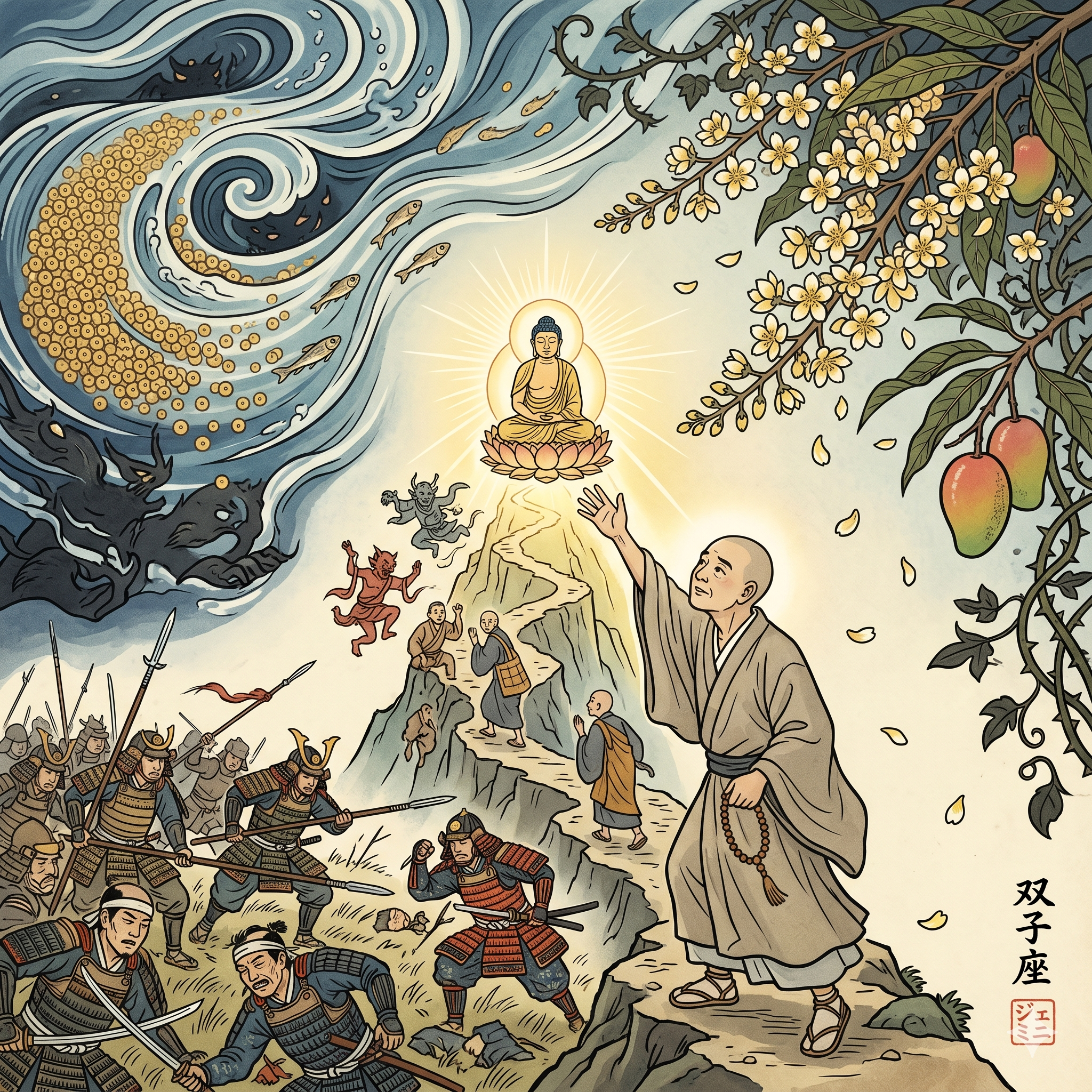 In this square illustration, I have visually interpreted Nichiren’s letter by weaving together four key allegories within a unified landscape. The visual narrative is as follows: