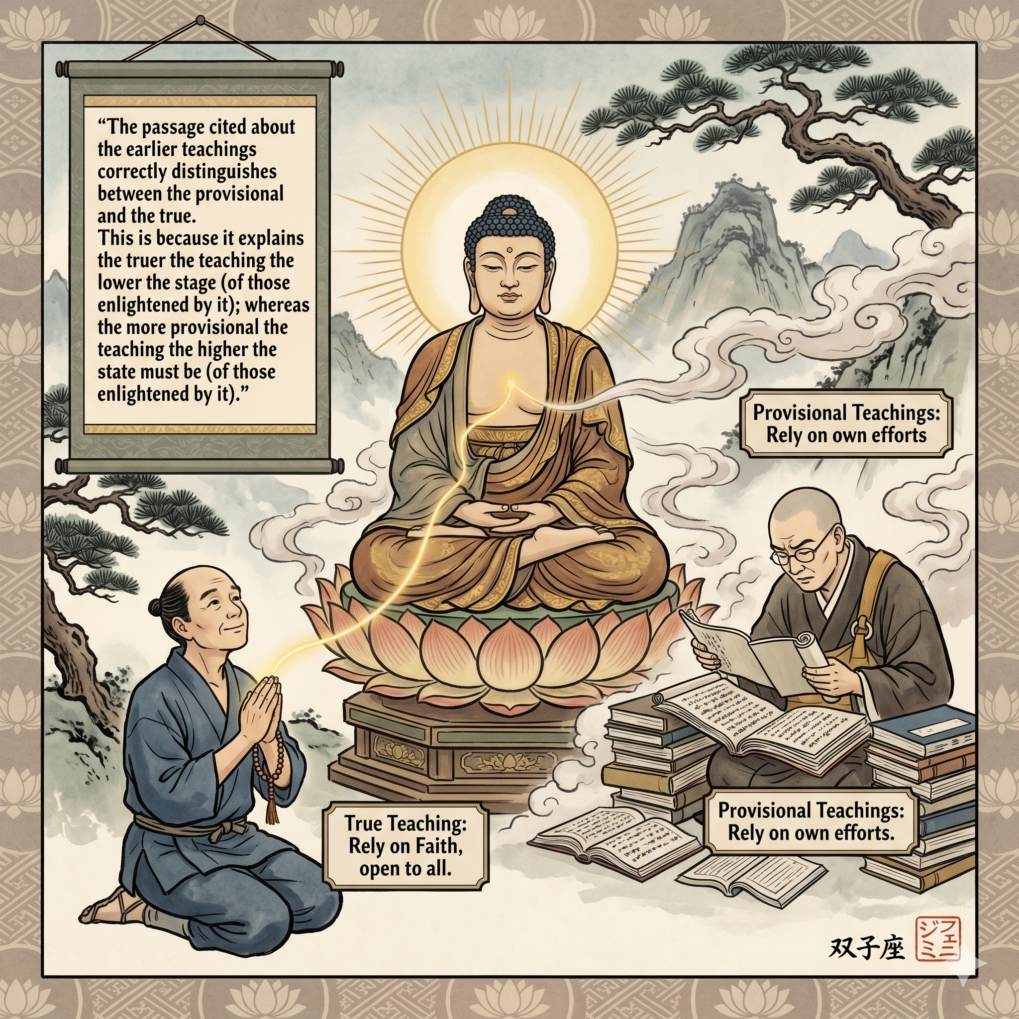 The scene contrasts the "True Teaching" with "Provisional Teachings" to illustrate the concept that the truer the teaching, the lower the required stage of the practitioner. On the left, a simple figure of pure faith, representing all beings, is directly illuminated by the Buddha’s mind, showing how the Lotus Sūtra is accessible even at a low stage of practice. In contrast, on the right, a scholar monk is surrounded by the intellectual labor of the provisional teachings, which required a high state of intellectual or meditative skill from those enlightened by them. This image reminds us that we do not need to rely on our own cleverness to harmonize with the seed of enlightenment within us.