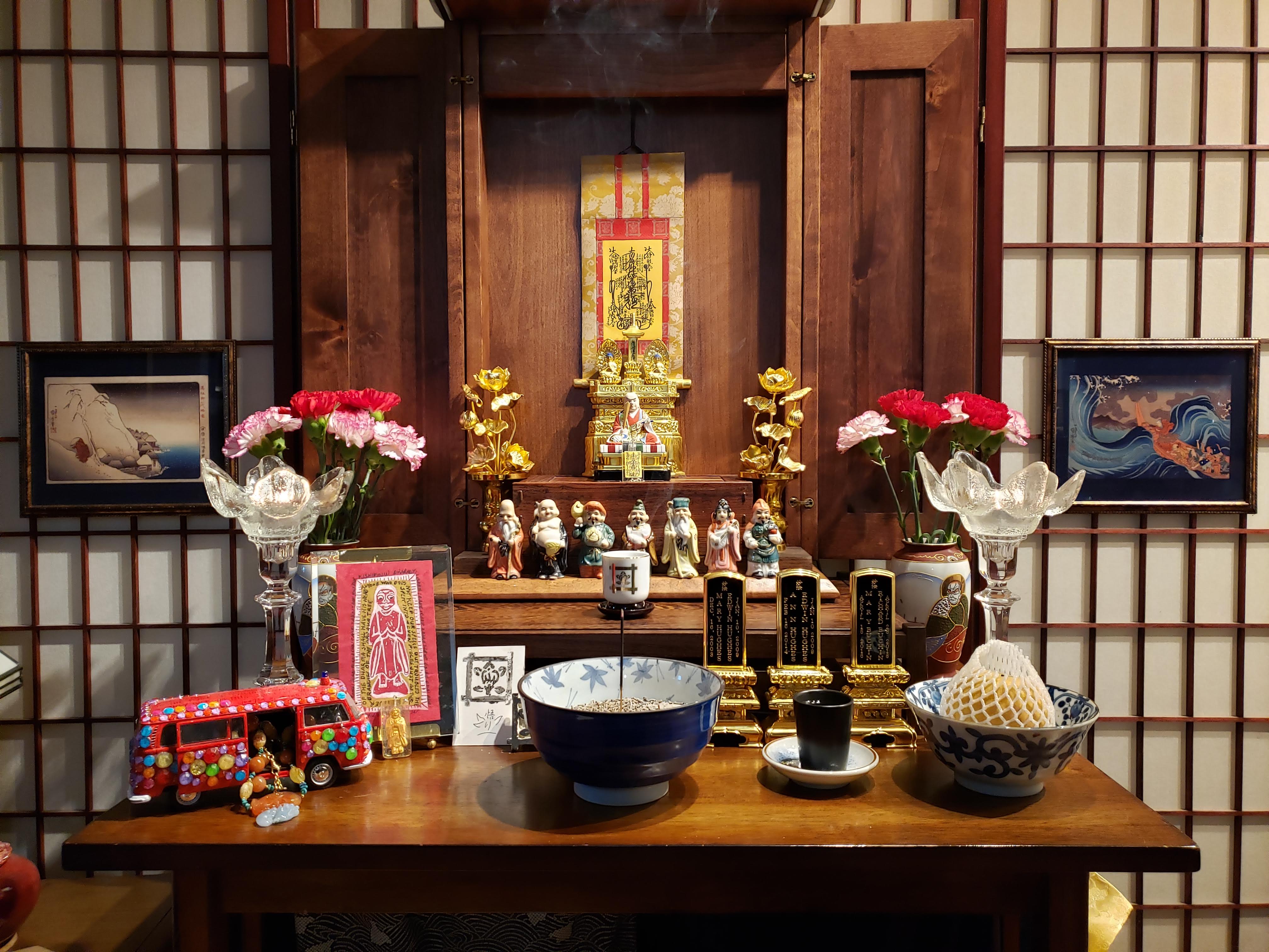 After the next Sunday service I picked up the eye-opened Seven Happy Gods and took them home. I’ve learned their names and each day I devote a portion of my daimoku to each. I’m not expecting any “benefit” from having these gods on my altar. Instead, I’m enjoying the idea of nourishing divine spirits, helping them regain the authority and power they possessed.