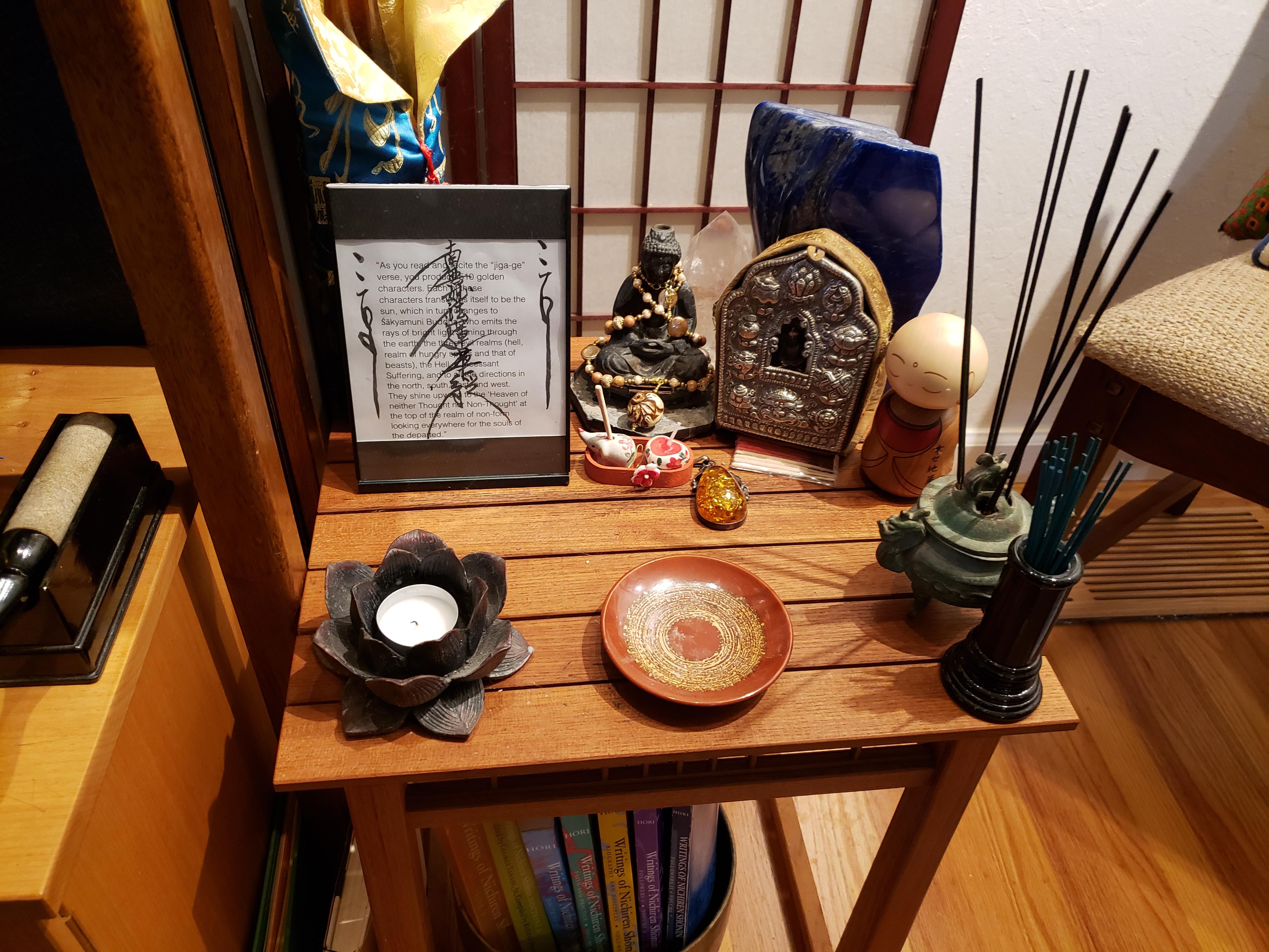 No problem. I have a side altar where I keep my “decorations,” which today in addition to Jizo Bodhisattva includes a traveling Tibetan prayer box stuffed with flags and a Buddha incense burner draped in a necklace. (These are all donations from my wife.)