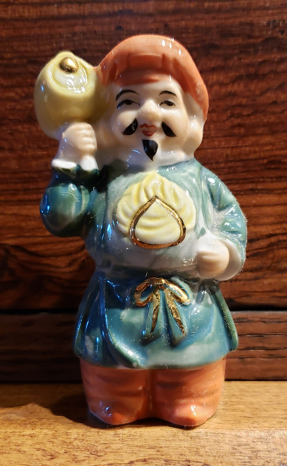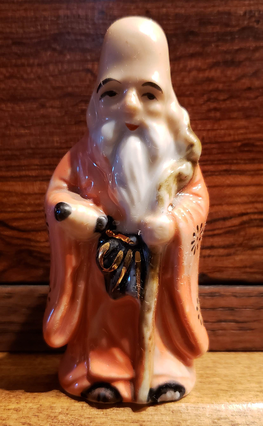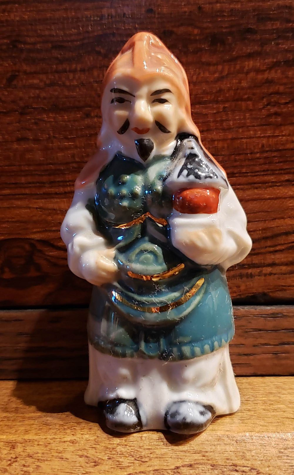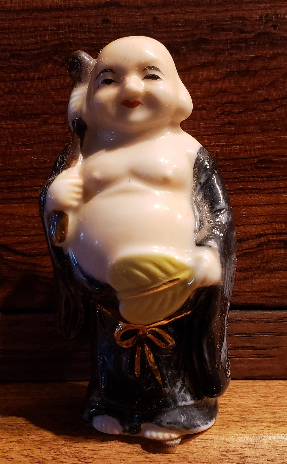 Then last month, I noticed a box containing the Seven Happy Gods had been donated to the church rummage sale. The porcelain figurines were made in Japan and purchased in the 1987. Someone had labeled each of them (mislabeling Fukurokuju as Jurojin) and crafted a display stand.