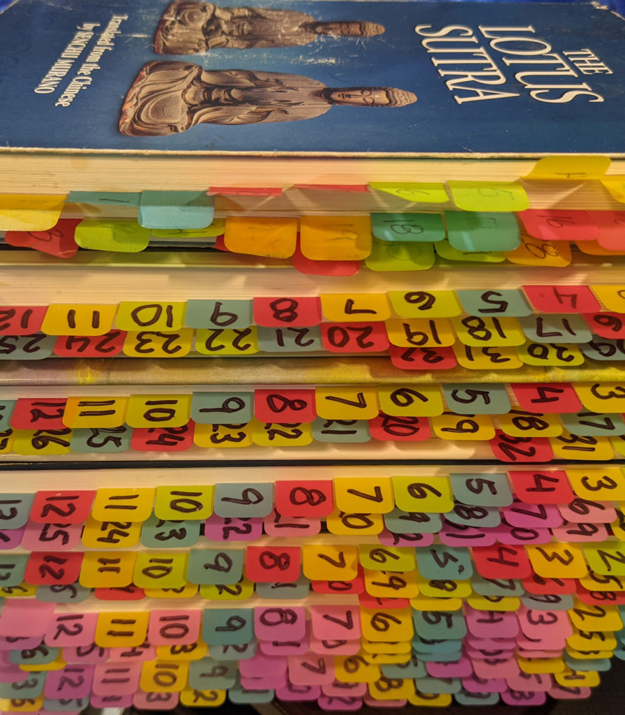 Recently I’ve needed to compare English translation of Kumārajīva’s Chinese translations of the Lotus Sutra. I thought this stack of books, all tabbed to divide the sutra into 32 parts, made an interesting photo. I’m using it to illustrate my 32 Days of the Lotus Sutra practice.