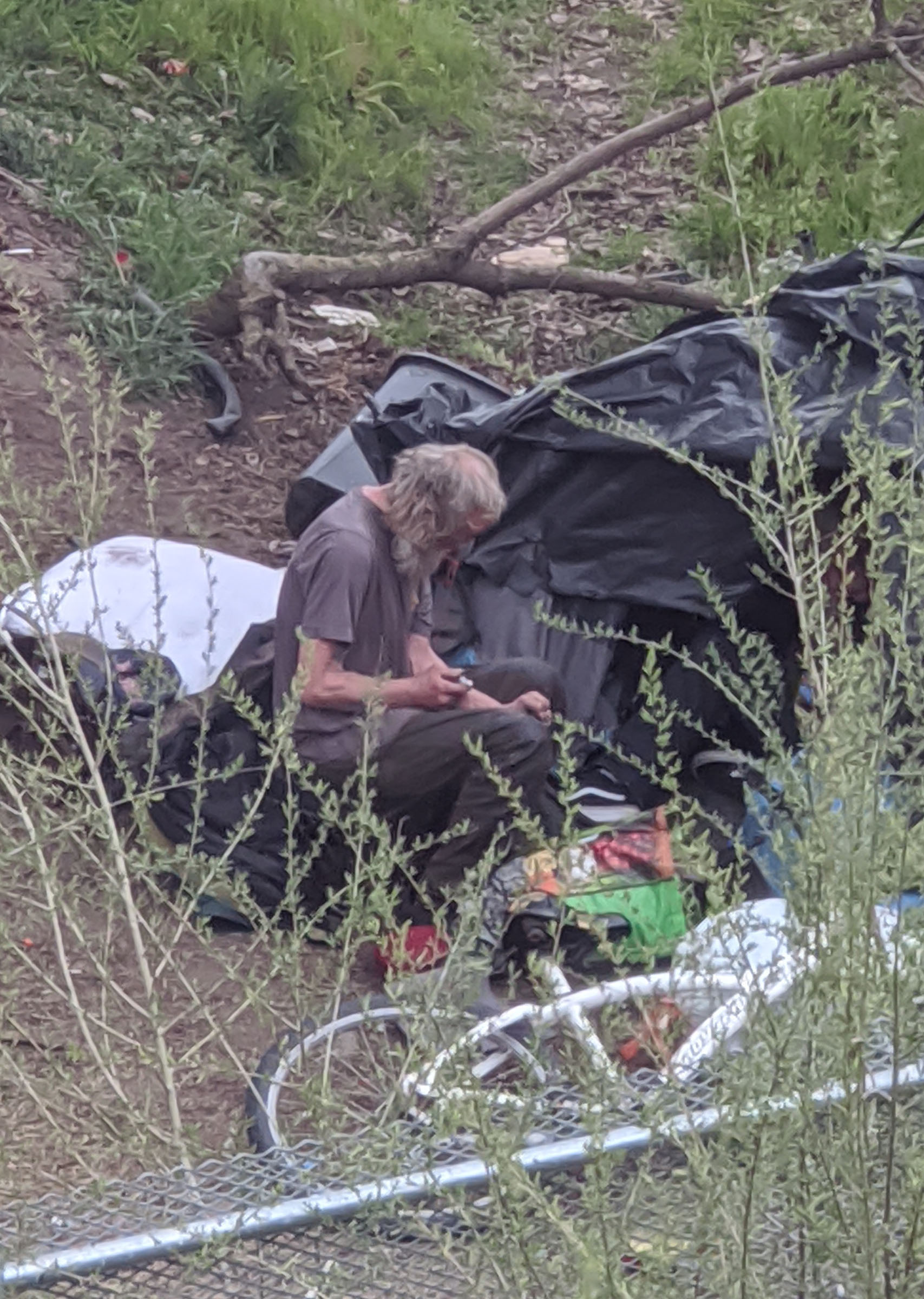 Looking out the window I saw a man climb our of his tarp shelter and proceed to inject something into his left arm. I took a photo and posted it on Instagram on my @jomariworks account.