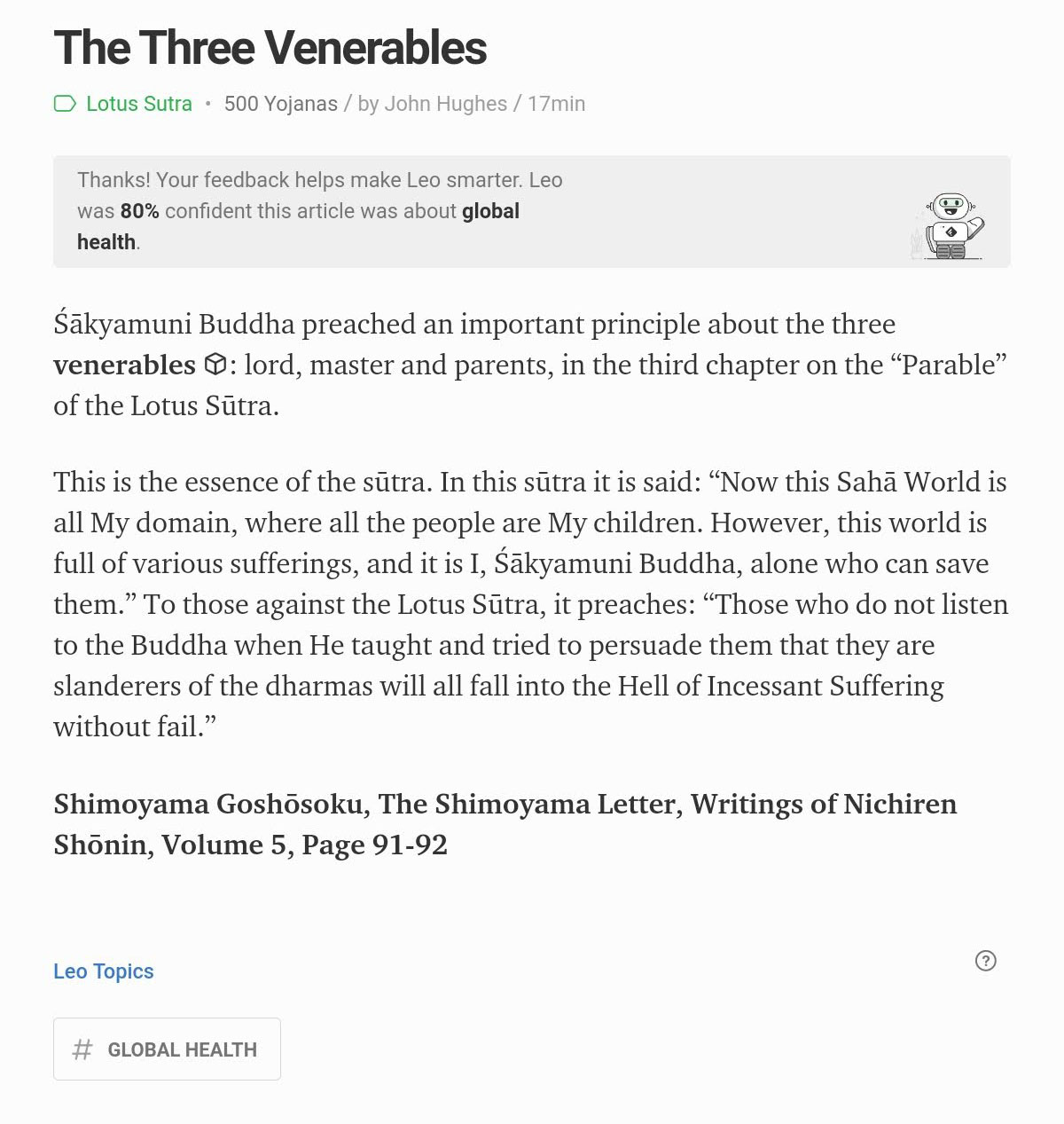 While I can see how the world population falling into the Hell of Incessant Suffering without fail could be considered a Global Health issue, I told Leo, “Sorry, no it’s not.” I can only guess what people searching for “# Global Health” issues thought about this quote.
