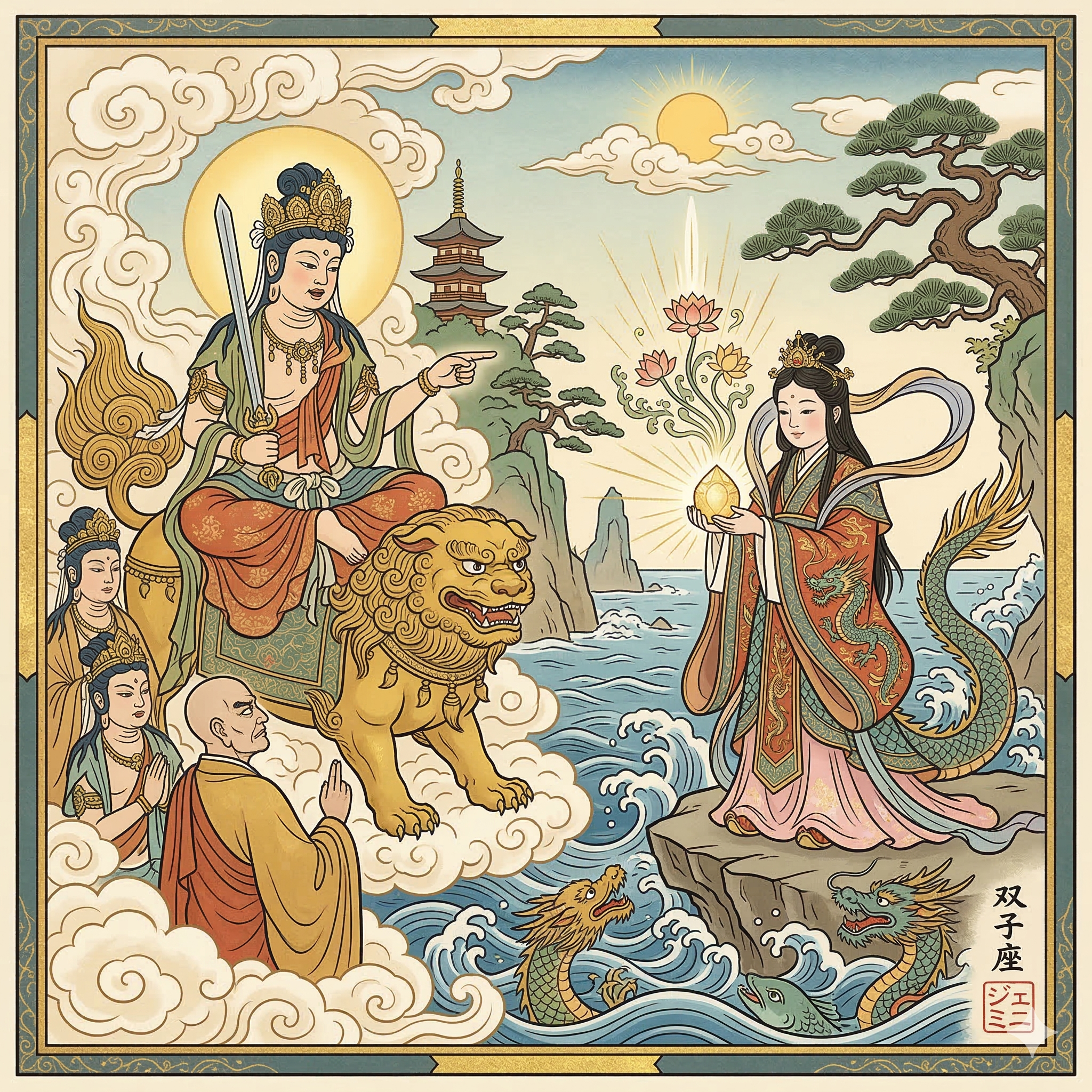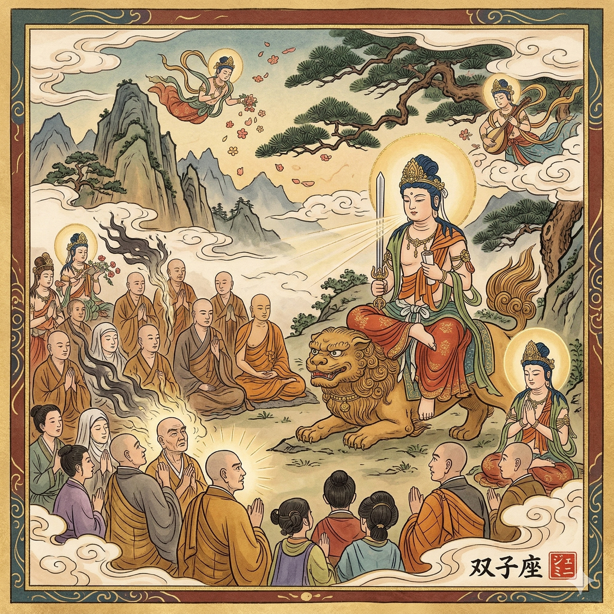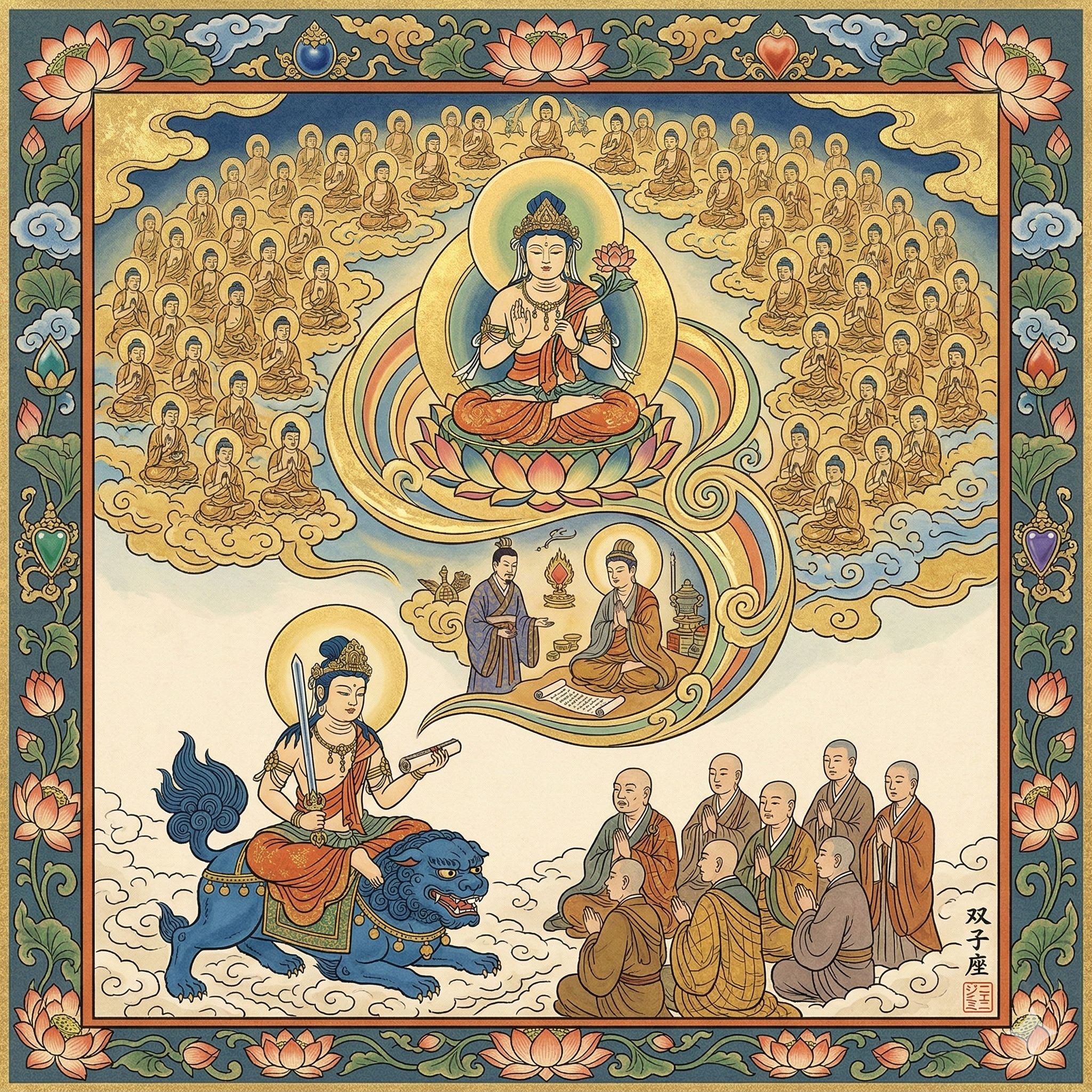 The surrounding assembly reacts with determination: Manjuśrī Bodhisattva on his lion (left) and Samantabhadra Bodhisattva on his white elephant (right) exemplify the courage and wisdom needed to propagate the sūtra. Disciples kneel and recite the sūtra, symbolizing their commitment.