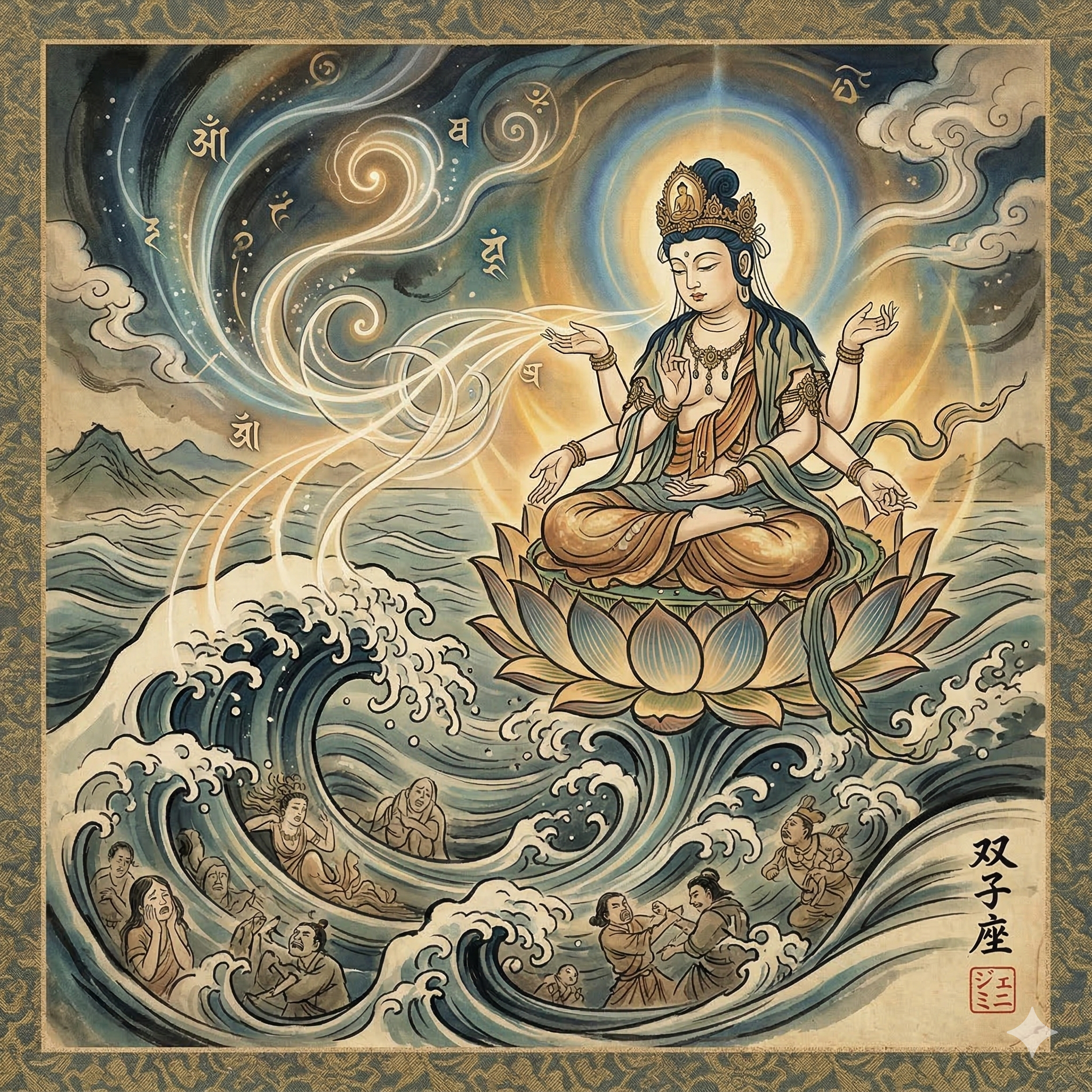 Here is a square illustration inspired by traditional Japanese Buddhist iconography, depicting the scene from the Lotus Sūtra. In the upper sky on a swirling cloud banner, the limited Kanji 妙法蓮華経 弘通 (Myōhō Renge Kyō Guzū) are rendered, symbolizing the 'Propagation of the Wonderful Dharma Lotus Sūtra'. Below, the great Treasure Stupa (Hōtō) dominates Vulture Peak, open to reveal Śākyamuni Buddha and Tahō Buddha seated together in a burst of golden light and flowers. Śākyamuni is speaking to a large, attentive assembly of Bodhisattvas, Arhats, devas, monks, and laypeople, who look up with reverence, representing the transmission of the teachings to all who practice with faith. In the lower-right corner, the artist's signature 双子座 is placed with a subtle red square hanko stamp containing the Katakana ジェミニ.