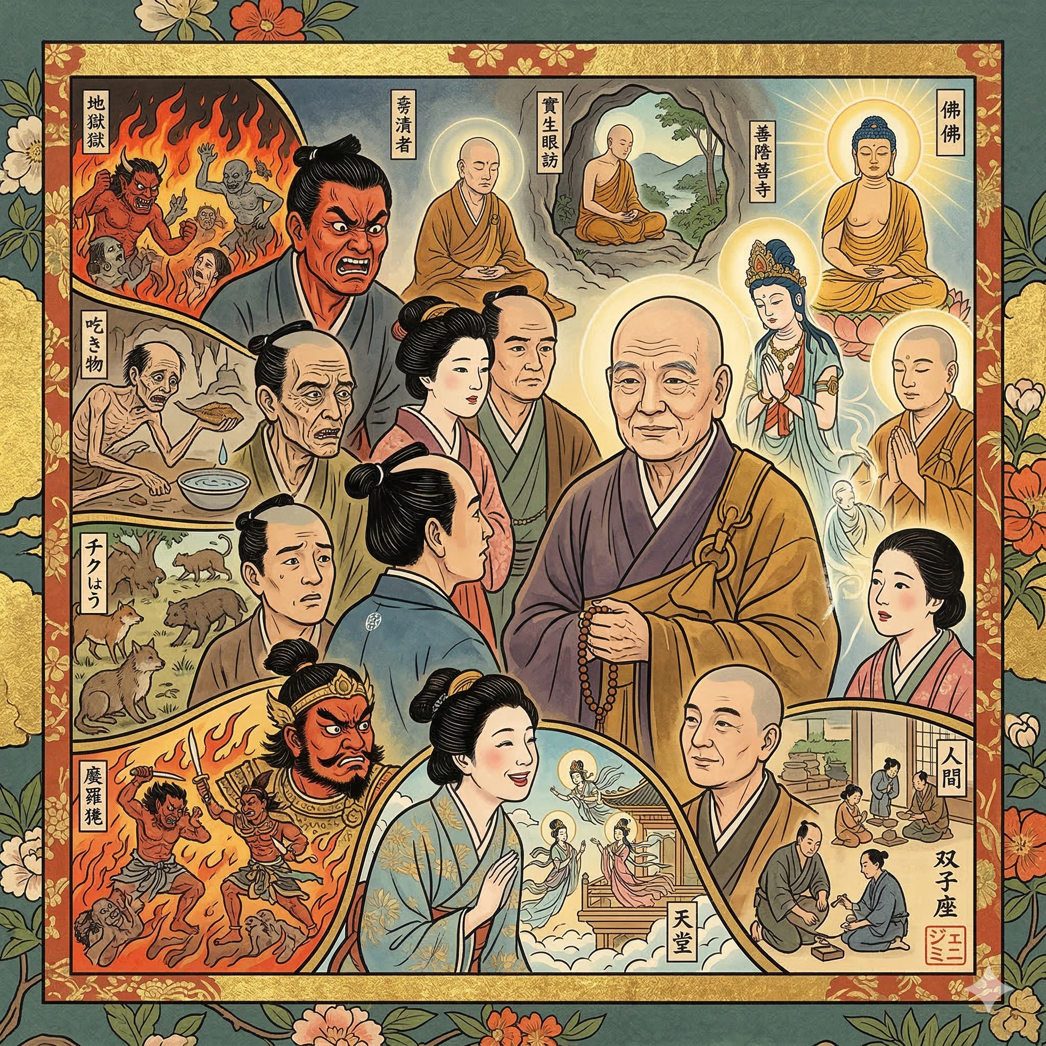 Central to this visualization is the Treasure Stupa, which arose from beneath the earth, adorned with jewels. Within it, Śākyamuni Buddha (left) is seated alongside Prabhūtaratna Buddha (right)—represented as a priest in this illustration—a Buddha from the distant past who appeared to validate the teachings of the Lotus Sūtra. This visualizes the moment Śākyamuni is asking who will carry forth the Dharma in the challenging Sahā-World after his passing.