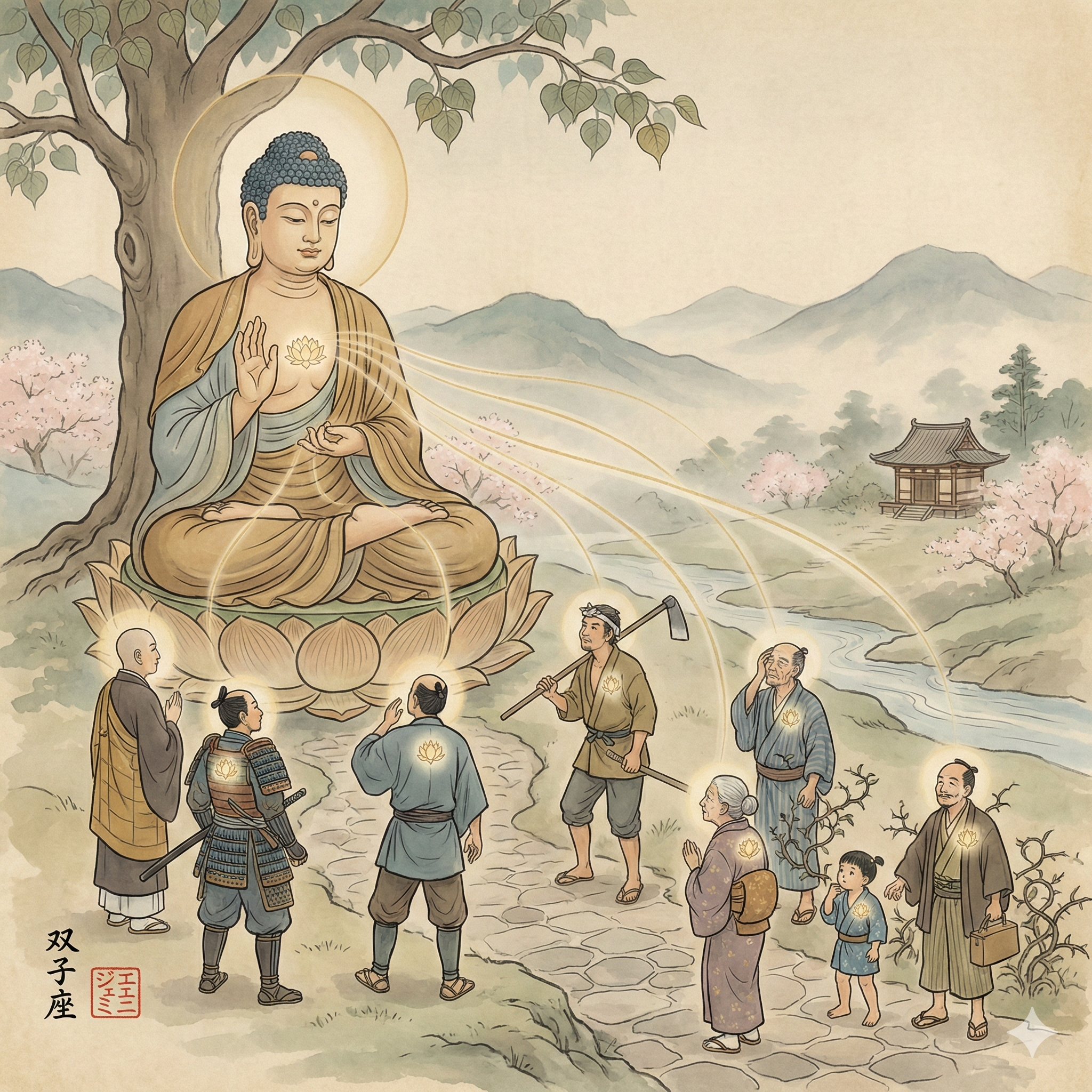 I'm currently breaking down the request's core components. I've pinpointed the format: a square illustration. I've noted the desired style as Japanese Buddhist iconography, specifically traditional painting. I've also identified certain exclusions that must be observed to avoid the inclusion of Amida Nyorai or any elements of a similar nature.
