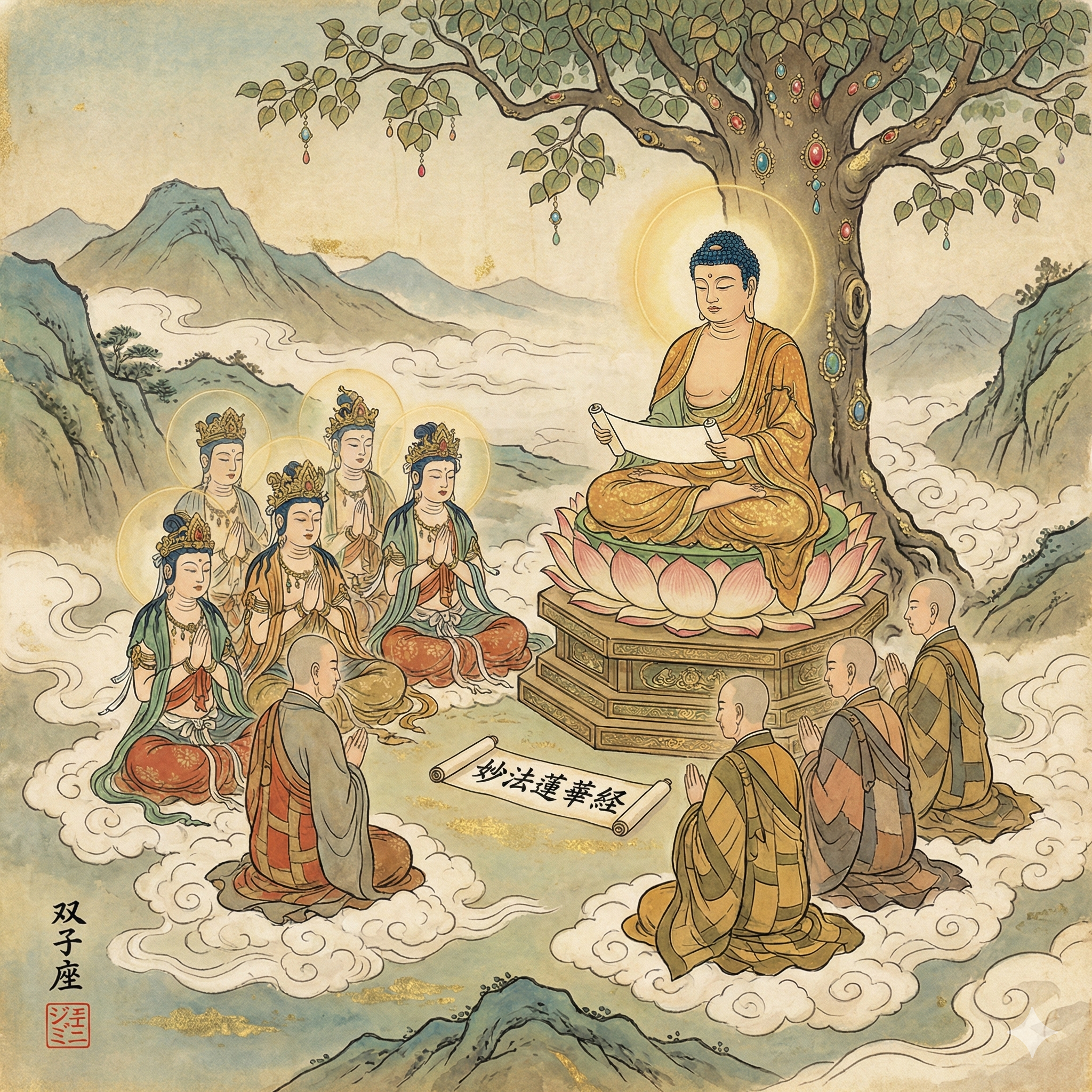 I'm now formulating the prompt, ensuring all elements are specified. I began with the base style and format. Next, the central scene was described: Śākyamuni Buddha under the Bodhi tree, teaching. I've specified his audience, including visual cues. Finally, I've integrated symbolic elements and the signature/seal details. I'm focusing on refining the description to reflect the desired aesthetic.