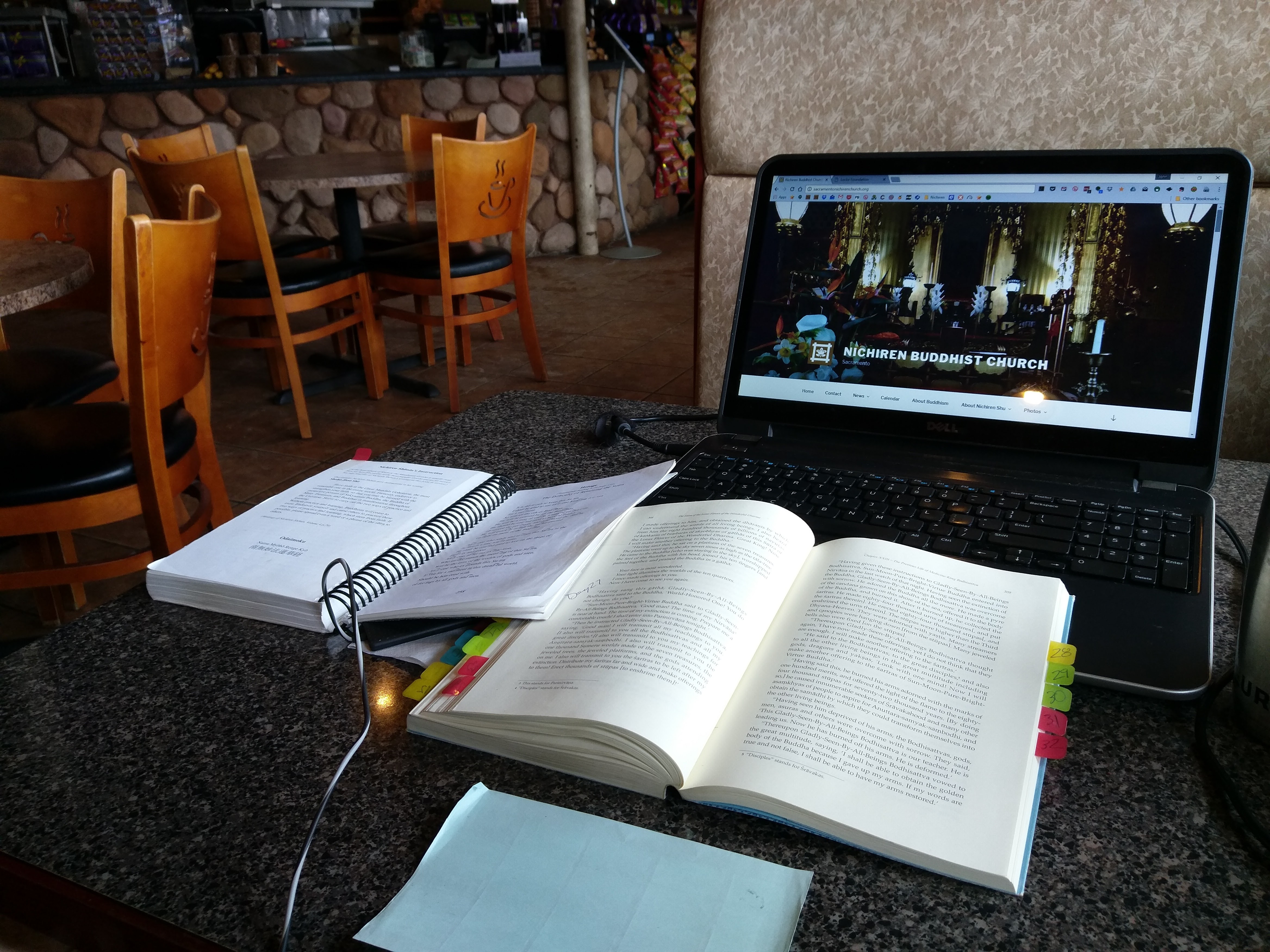 On past trips I’ve stayed in hotels and kept to my daily practice schedule before and after visits to my father-in-law. But this time my wife and I are saving the hotel cost and bunking on my father-in-law’s couch. And rather than trying to practice in my father-in-law’s house, I’ve decided to do my reading of the shindoku and English versions of the Lotus Sutra each morning over coffee and then take advantage of the free WiFi to post here.