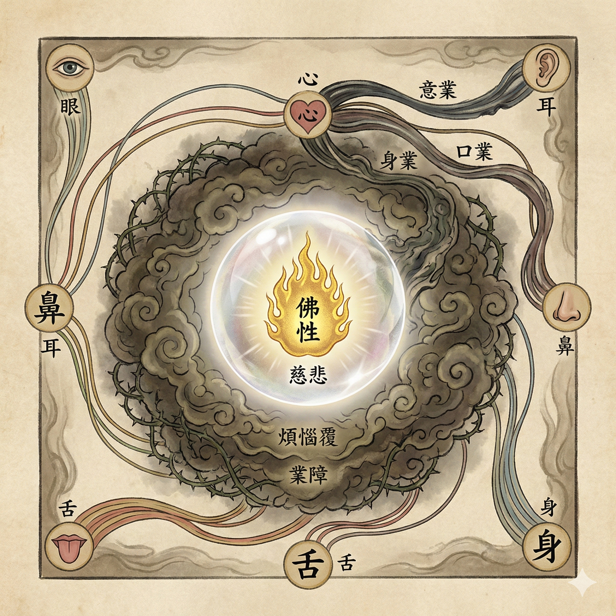 Create an illustration explaining this concept. The illustration should be square. The inherent Buddha is a flame-like light and the Bodhisattva nature a globe enclosing this light. Viewed from outside, the Bodhisattva globe is obscured by the defiled thoughts, words and actions that are generated from our sense organs.