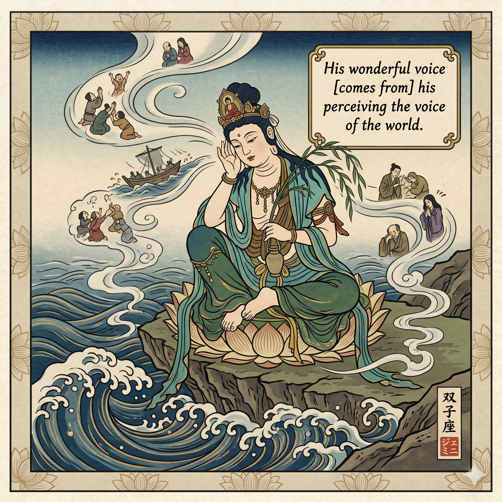 Śākyamuni Buddha gives this description of World-Voice-Perceiver Bodhisattva (Kannon, Kanzeon, Kuan Yin, Avalokitesvara) to Endless-Intent Bodhisattva in Chapter Twenty-Five of the Lotus Sūtra. This Bodhisattva is the embodiment of compassion. When we allow ourselves to hear and be present for all of the suffering that happens in the world, then we are hearing compassion. When we have the courage not to run away from misery but to face it and live through it, we bring this Bodhisattva to life in our world and inspire compassion in all beings.