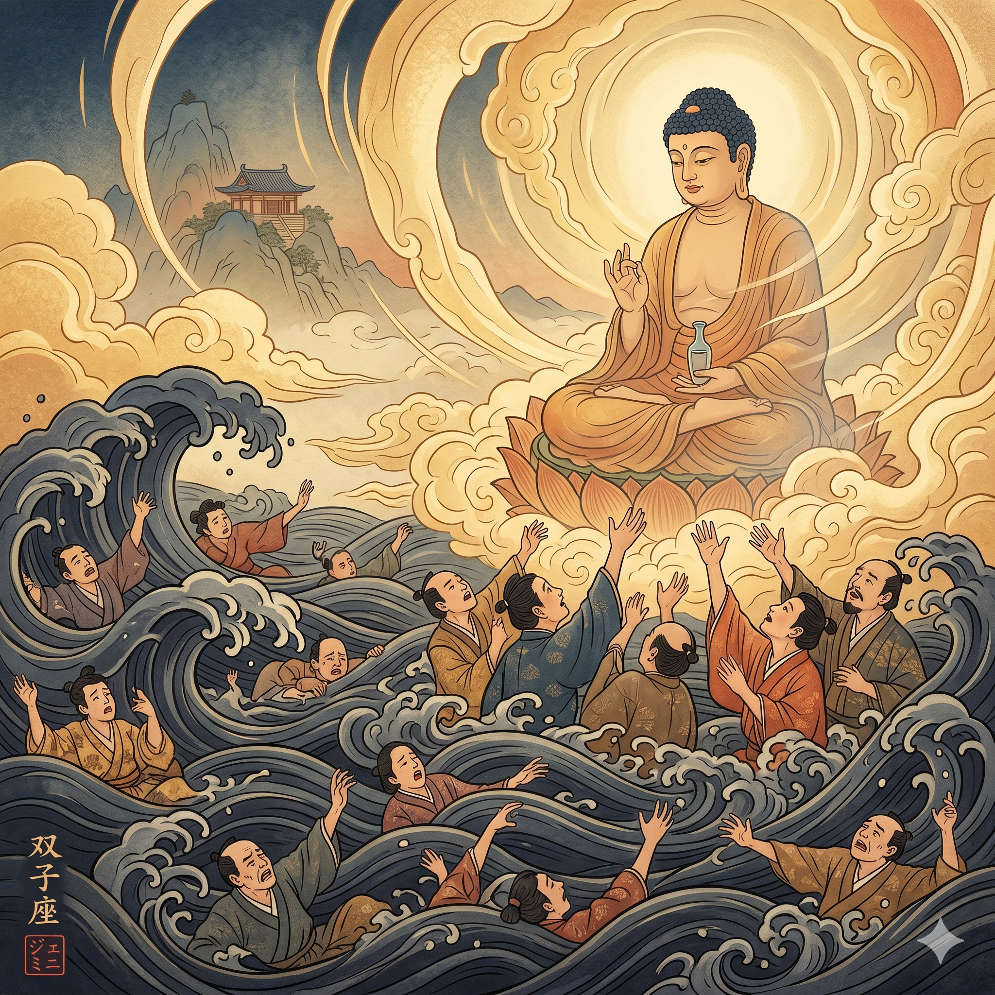 Here is a square illustration inspired by Chapter Sixteen of the Lotus Sūtra. I have centered the image on the figure of Śākyamuni Buddha, who is depicted holding a vessel of medicine—a key element from the parable of the wise physician. Below him is the "ocean of suffering," where figures look up with longing and admiration as they begin to recognize the path to liberation. I have integrated the traditional artist's signature (双子座) and the red square seal (hanko) containing the katakana "Gemini" in the lower-left corner.