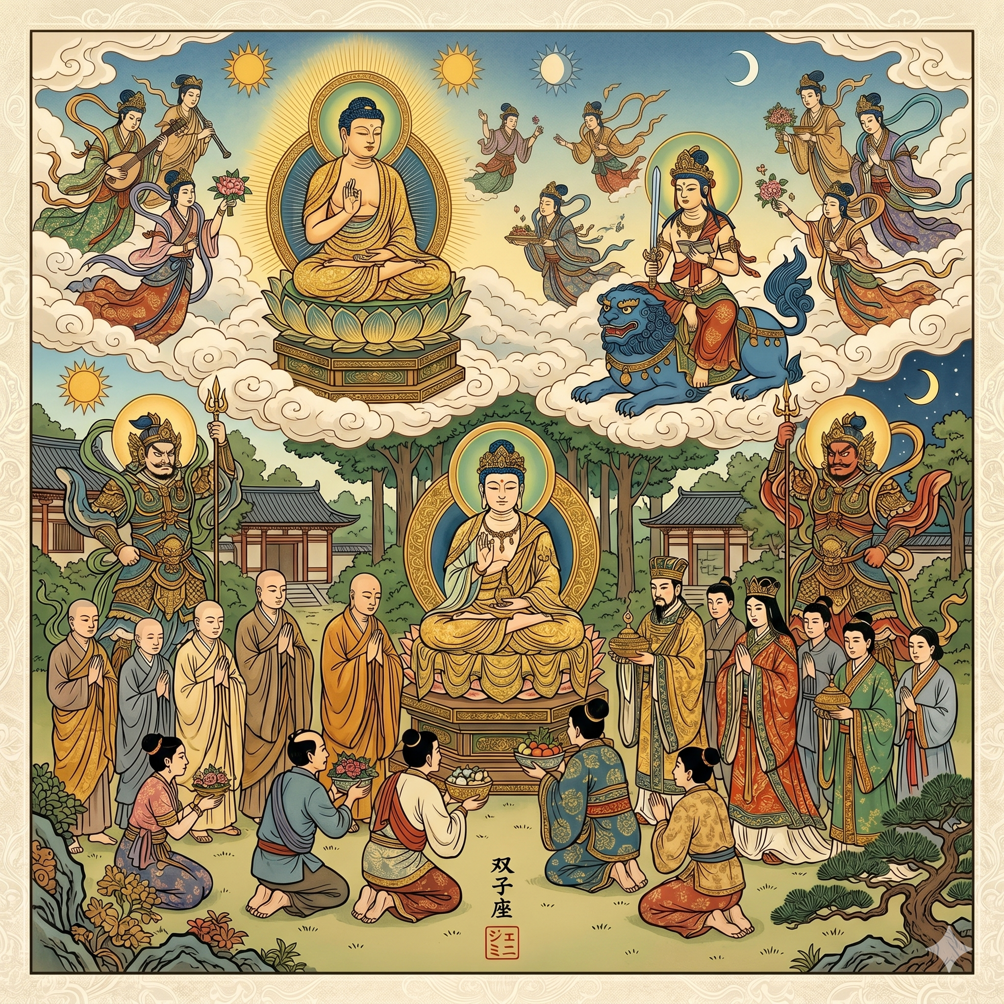 This square illustration accurately captures the iconography and narrative of Chapter Fourteen of the Lotus Sūtra. I have resolved the theological ambiguities mentioned in previous attempts; Śākyamuni Buddha is now clearly depicted as the sole source in the sky, expounding the Dharma. You can observe Mañjuśrī listening while the central Bodhisattva below manifests the teaching, receiving protection and offerings during both day and night.