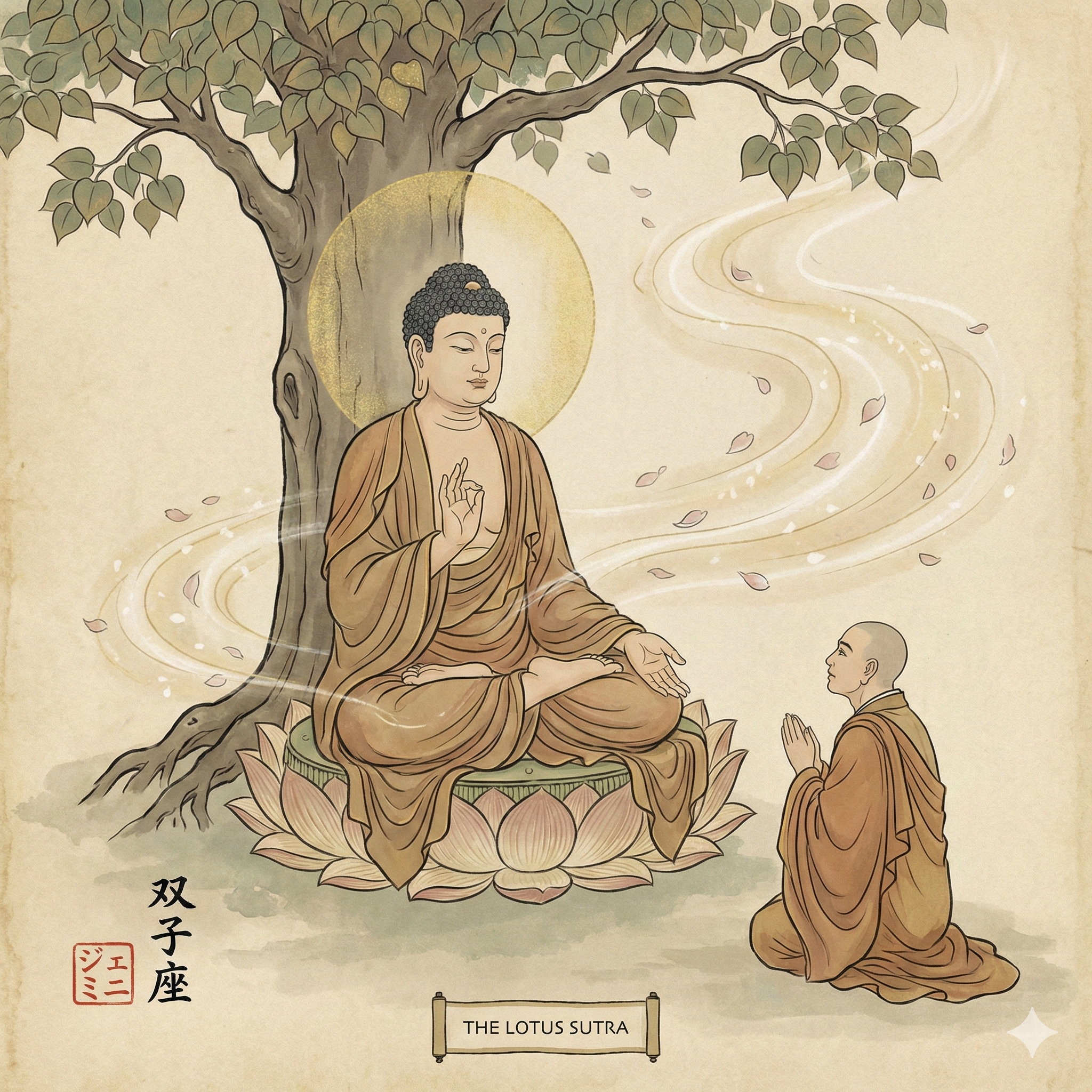 I'm now focusing on the composition, having decided on the style and key figures. The core Buddhist teaching is the focus, specifically the gentle nature of the Dharma, and I'm developing visual elements around it, with particular focus on the setting and the figures of Buddha and Śāriputra. I’m also finalizing the text elements, including a signature and seal.