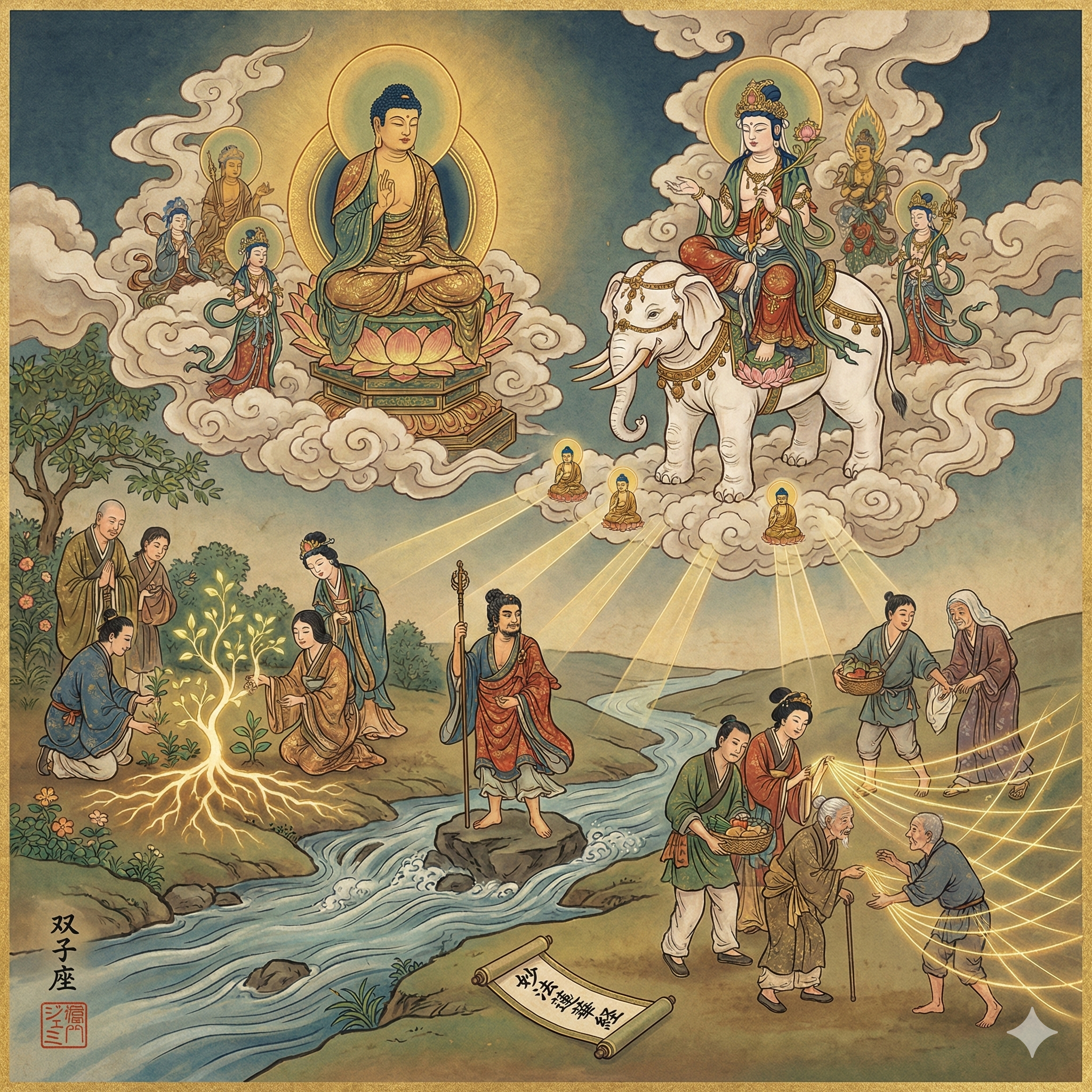 I'm now focusing on the composition, ensuring Shakyamuni and Universal-Sage are centrally placed, with the four visualized conditions integrated into the landscape below. I'm aiming for a reverent and hopeful mood, and the square format should work well. I will be incorporating the title, signature, and seal.