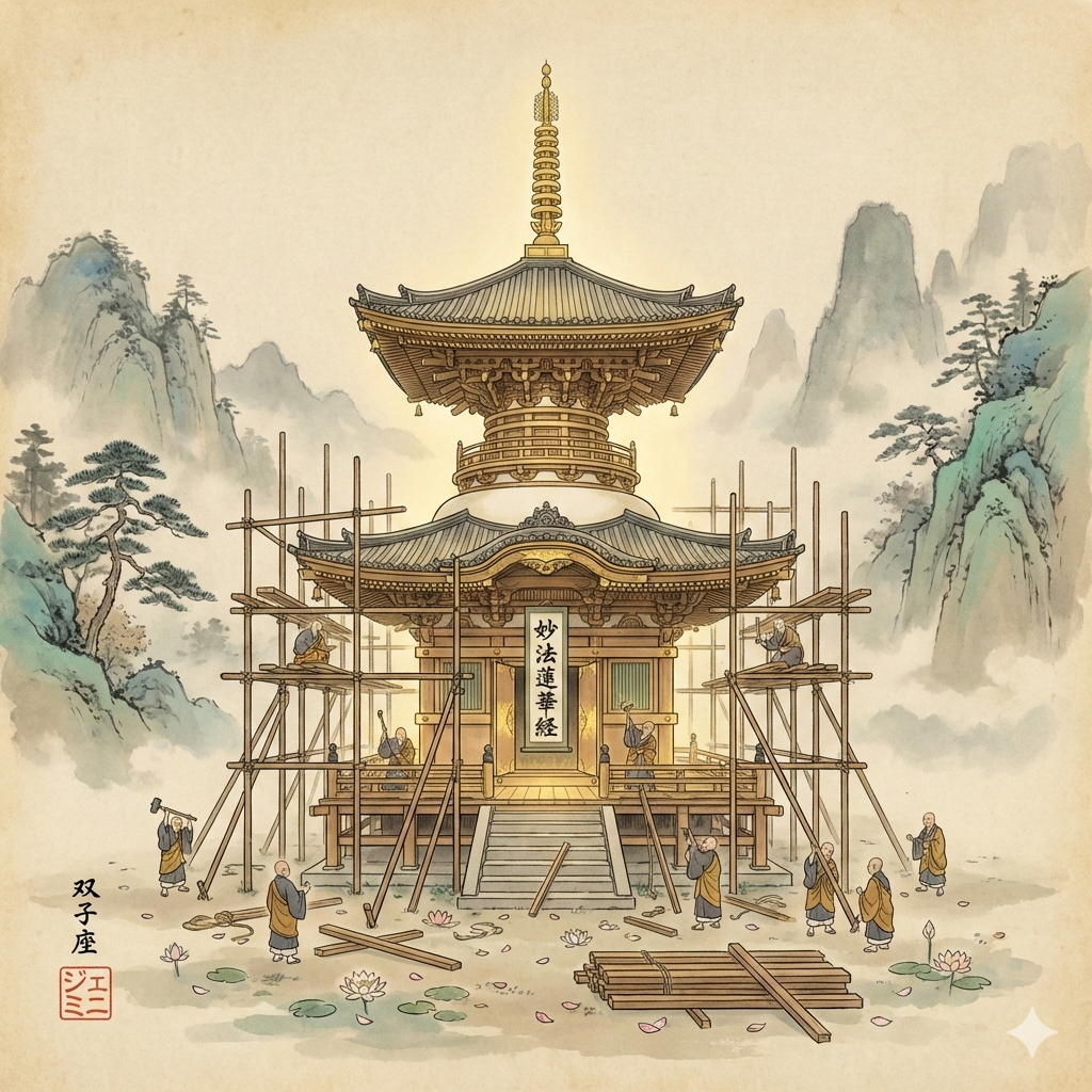 I am now visualizing the key elements. The scaffold will be a yagura-style structure, clearly supporting a Japanese pagoda, which will be the central element. I'm considering how to depict the dismantling process, possibly with stylized figures. Lotus flowers and the Lotus Sutra characters will be included to represent the core meaning. I am settling on a Nihonga style.