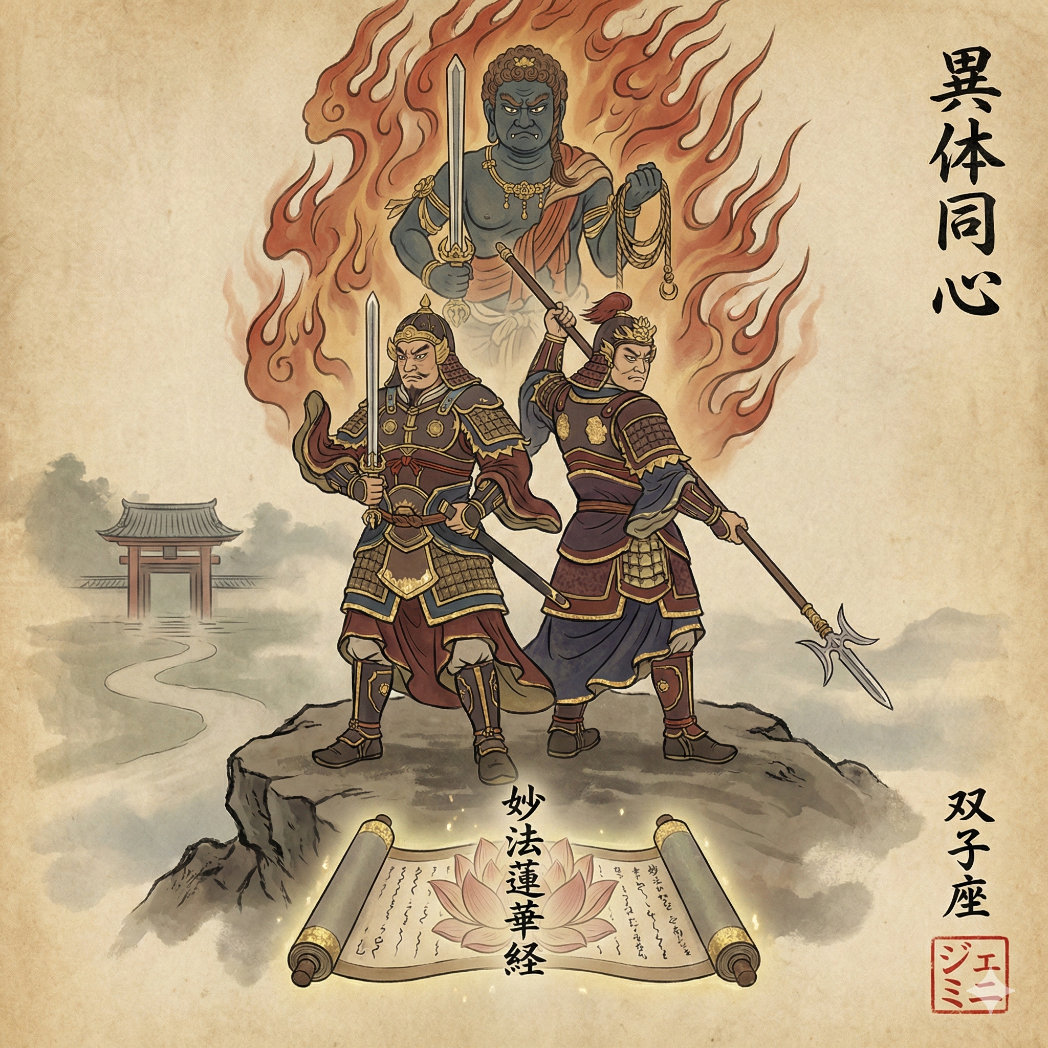 I'm now detailing the setting, composition, and specific iconography of the illustration. Jikokuten and Zōchōten will stand as the central figures, back-to-back. I'm placing Fudō Myōō above them for protection. The Lotus Sutra scroll or pagoda will be central. A rocky, misty landscape and temple gate in the distance will frame the scene, and I'm adding "異体同心" near the top to reinforce the unity theme. I am aiming for a Nihonga style. I will also be adding the required signature and seal.