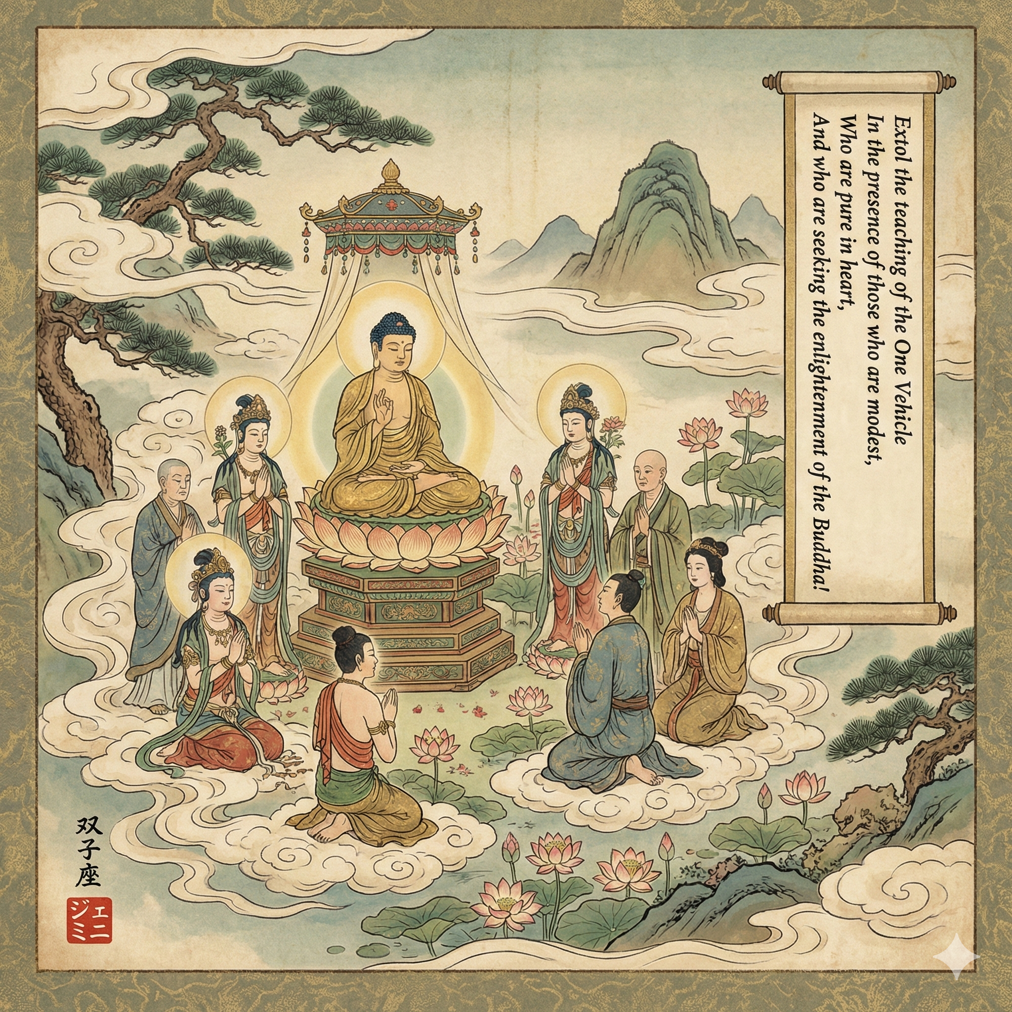 I'm checking the illustration to make sure it meets the requirements. I've confirmed the image captures the Japanese Buddhist style with Śākyamuni Buddha. I've also verified the presence of devotees and a scroll with the specified text. Additionally, the signature '双子座' is present.