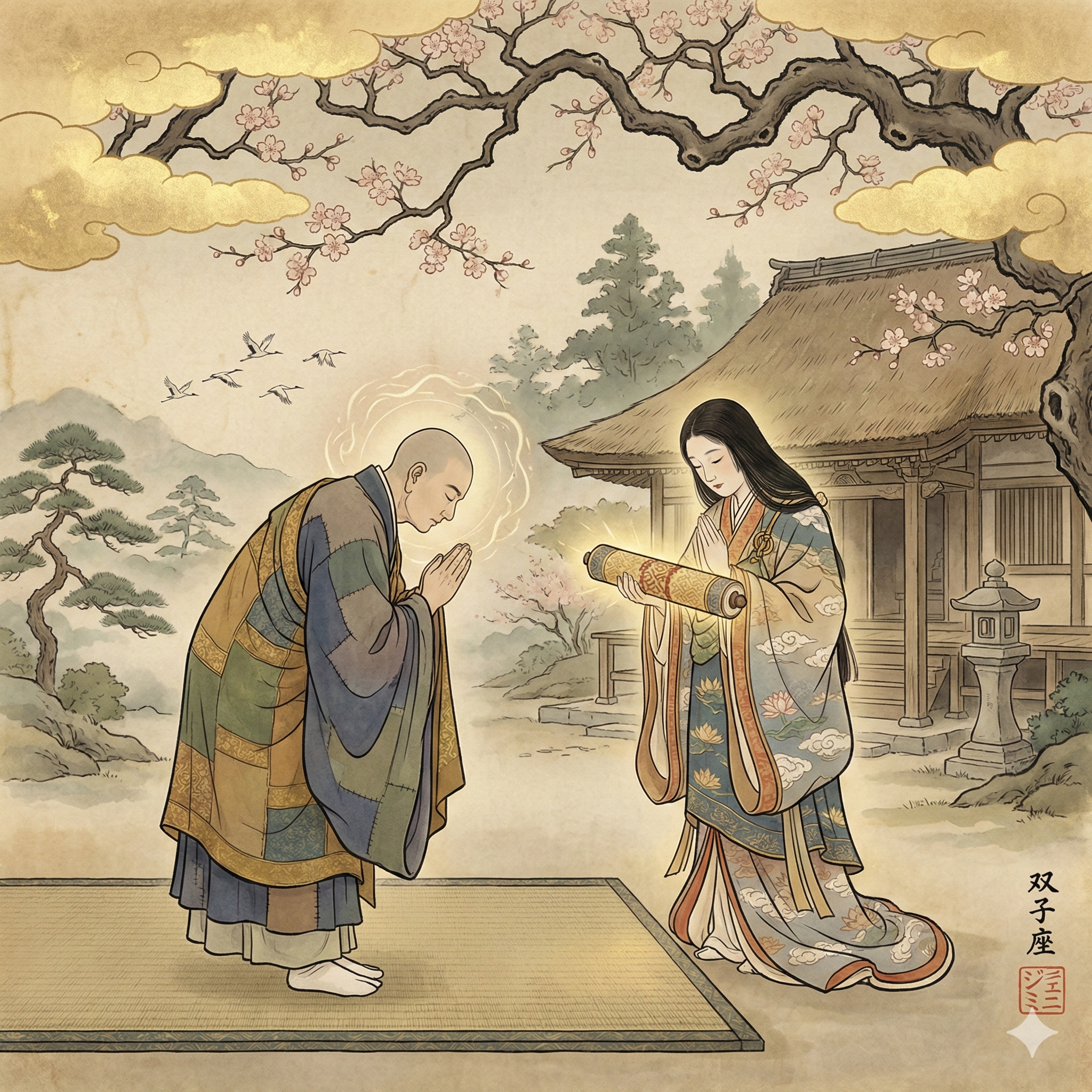 I am now structuring the scene; I have defined two figures: one bowing, the other holding a sutra scroll. I am exploring visual representations of respect and the sutra itself, within a square format, using traditional Japanese Buddhist motifs. The signature and seal are earmarked for integration. I'm focusing on creating a serene atmosphere.