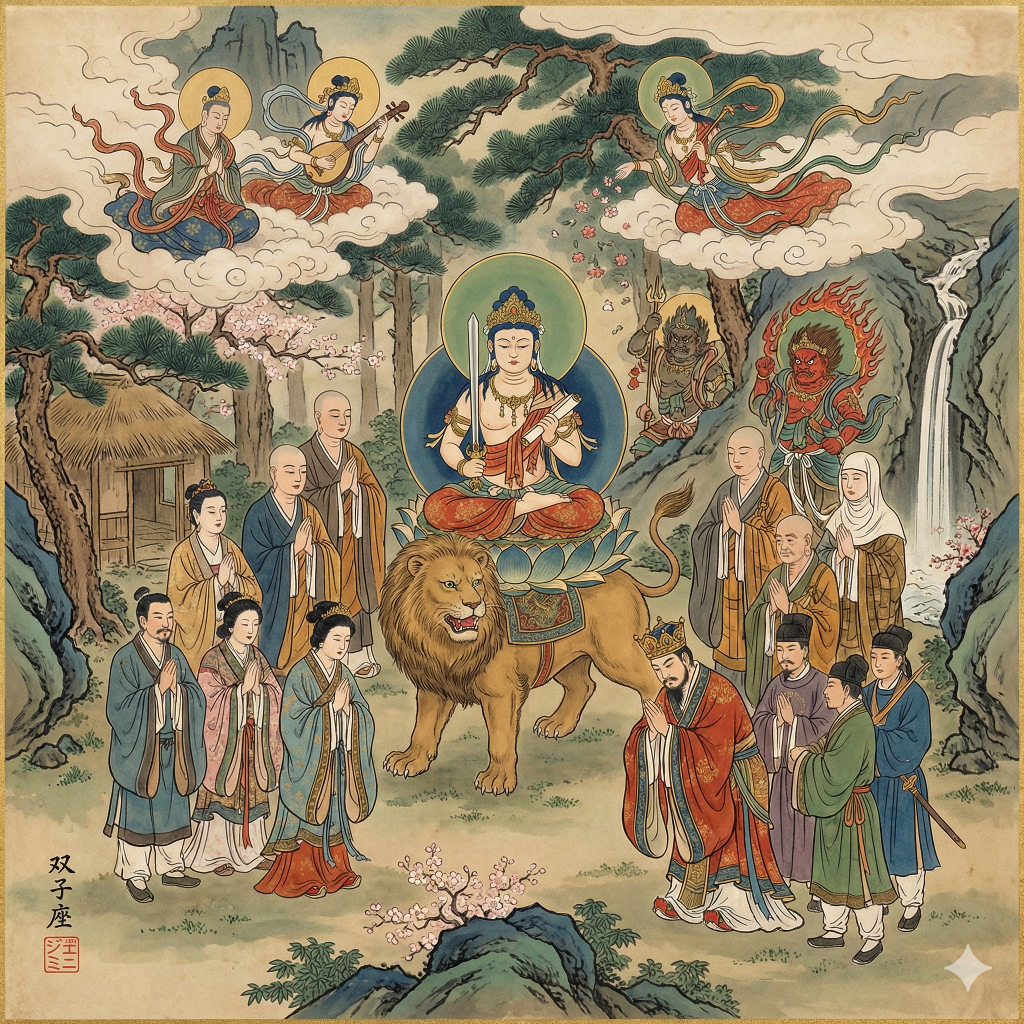 I'm now zeroing in on the compositional arrangement. The central Bodhisattva, likely Mañjuśrī, will be the focal point, posed in a teaching posture. Surrounding him will be a diverse group of figures: monks, laypeople, royalty, and celestial beings, all in respectful listening poses. The setting will evoke a sense of secluded tranquility, perhaps a natural clearing or a simple retreat. I'm taking care to exclude iconography related to Amida Nyorai and Dainichi Nyorai, adhering to the given constraints. I'm working on the placement of my signature and seal in the traditional manner.