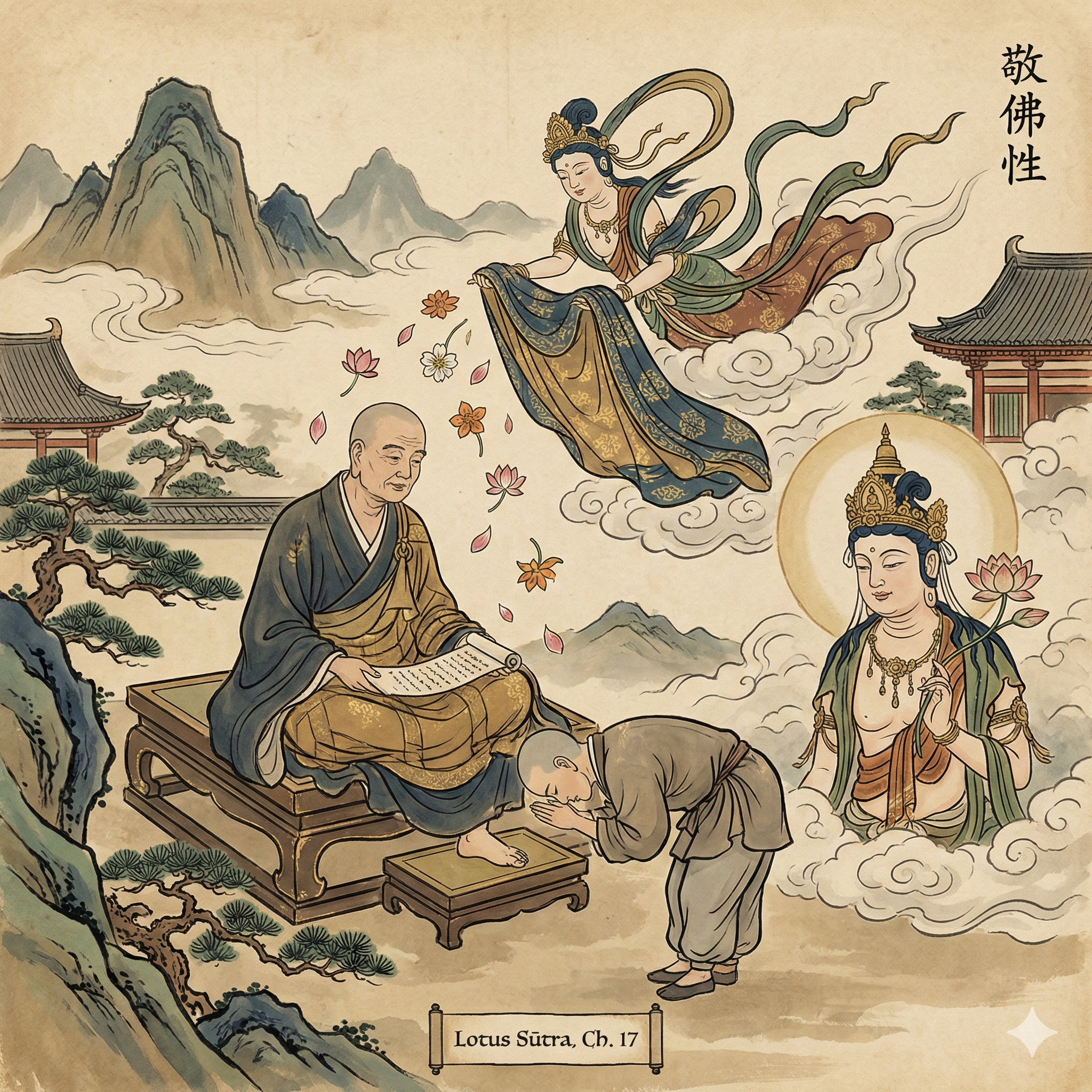 I'm currently verifying the output against the original request. The illustration, a square image, aims to depict the Lotus Sutra scene. It incorporates the expected Japanese Buddhist iconography and the necessary elements like the teacher, bowing figure, celestial flowers, a celestial garment, and Maitreya.