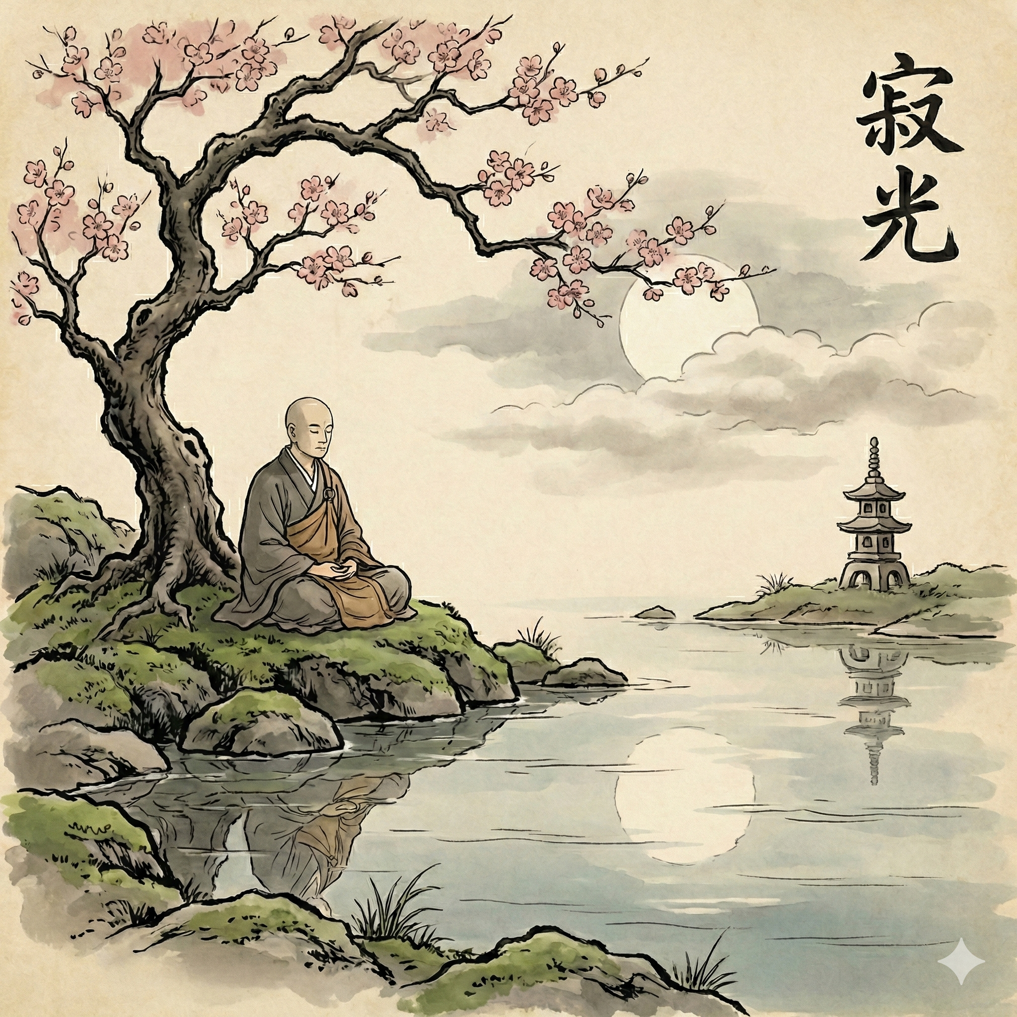 I'm now focusing on synthesizing the visual elements to create a cohesive scene. The goal is to represent "tranquil extinction" and "present-moment awareness" in a single illustration. I'm prioritizing the monk's meditation, the reflective pond, and the pagoda. The moon's reflection is critical, symbolizing inherent enlightenment. I will also include Japanese characters for "Tranquil Light" to reinforce the theme. I'm aiming for a traditional Japanese ink wash painting style.