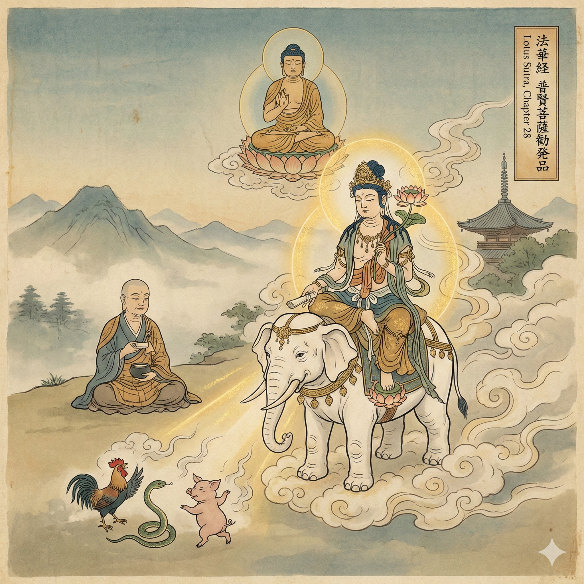 I'm now integrating the elements into a cohesive scene. I have defined the central figures as Shakyamuni Buddha and Fugen Bodhisattva, alongside a practitioner. Symbolic representations of key qualities and the setting are also decided. The style is Japanese Buddhist iconography, and I will be using a square format.